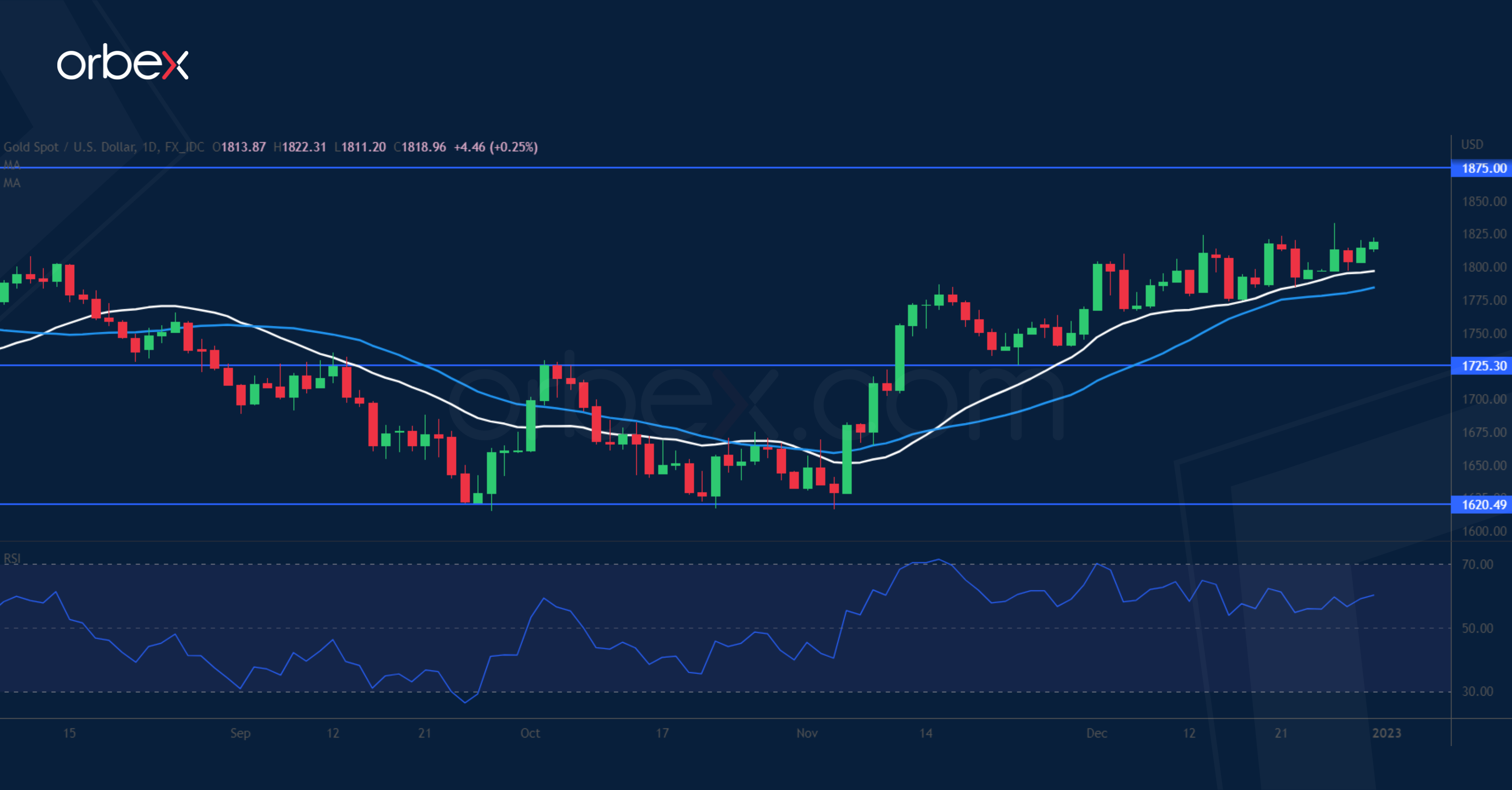 ارتفعت أسعار الذهب مرة أخرى بالتزامن مع ضعف الدولار الذي يفتقر إلى أي محفز إيجابي. كما تزايد الطلب على الذهب بفضل ضعف الدولار متأثراً التوقعات بشأن تباطؤ رفع أسعار الفائدة من جانب بنك الاحتياطي الفيدرالي. وفي الوقت نفسه، جدد قرار الصين بإعادة فتح حدودها في شهر يناير الجاري الآمال في أن يستعيد أكبر مستهلك للذهب نشاطه في السوق الفعلي. وعلى صعيد آخر، قد تتزايد معدلات التقلب مع تدفق السيولة مرة أخرى إلى السوق في الأسبوع الأول من العام الجديد الحافل بمجموعة من البيانات الاقتصادية المهمة. وعلى الجانب السلبي، ففي حال جاءت بيانات الوظائف الأمريكية إيجابية، فسيعكس ذلك استمرارية مرونة سوق العمل، مما سيترتب عليه ارتفاع الدولار وإحكام ثيران الذهب قبضتهم على السوق. ويمثل مستوى 1875 المقاومة التالية للذهب، بينما يستقر مستوى الدعم الجديد عند 1725.
