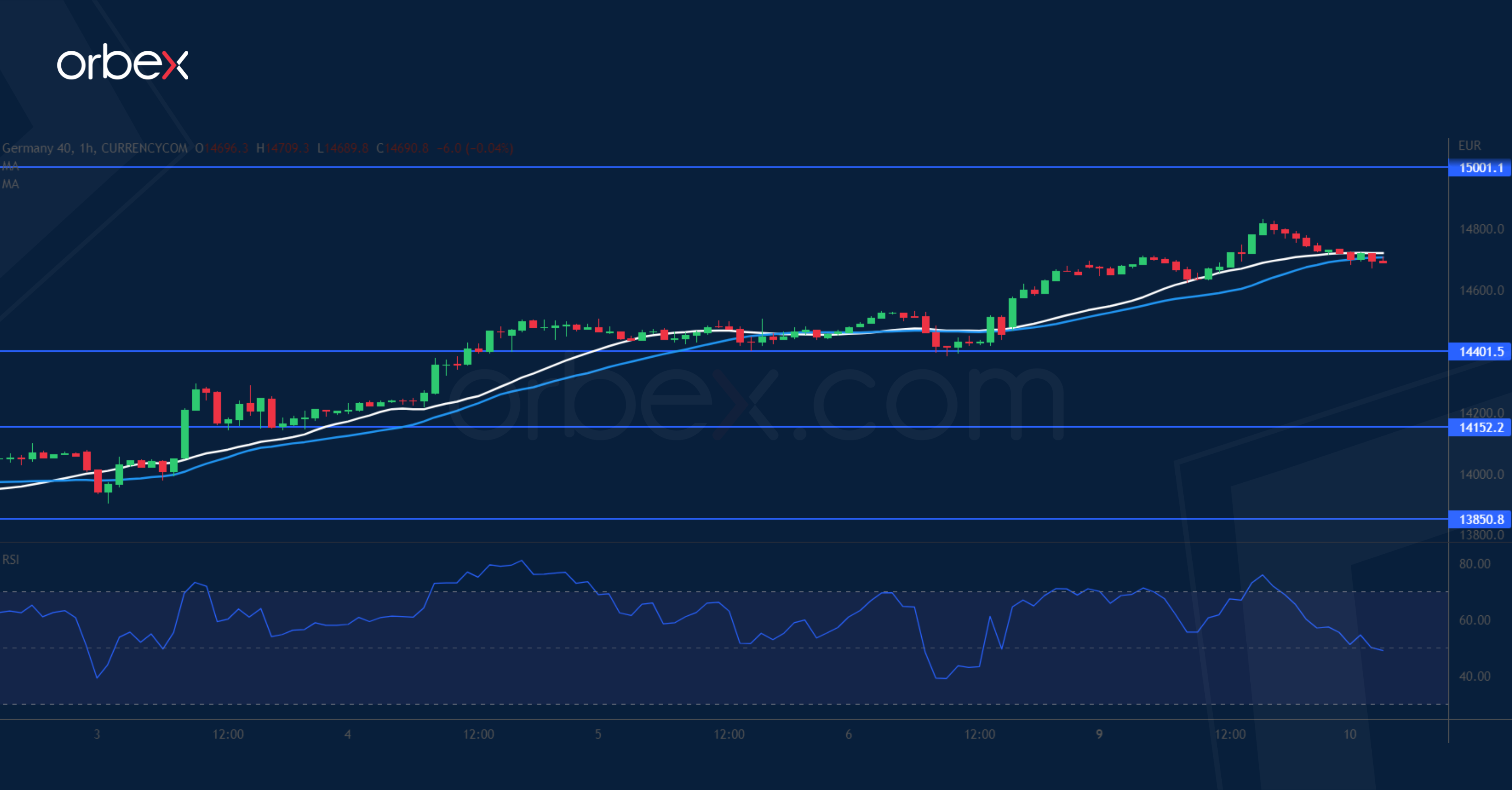 وفي حالة التراجع، سيكون الدعم الجديد هو المستوى الرئيسي للحفاظ على الاتجاه الصاعد للمؤشر قائماً. فيما قد يتداول المؤشر الألماني بوتيرة عرضية على المدى القصير بعد وصول مؤشر القوة النسبية إلى منطقة التشبع الشرائي. قد يكون المستوى النفسي 15000 هو المستوى المستهدف التالي عندما يعود التقلب.