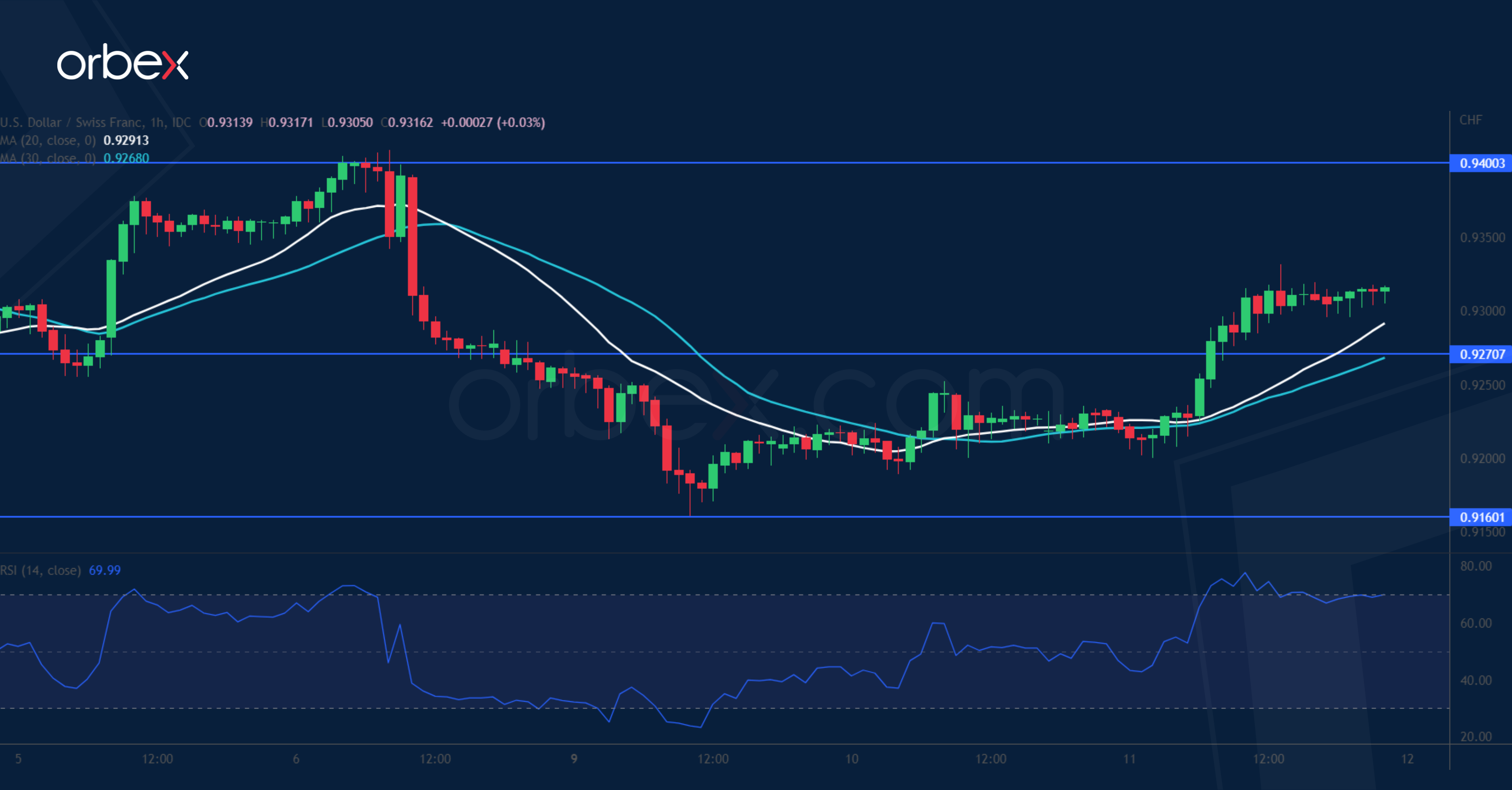 فيما دلّ إغلاق زوج الدولار/فرنك أعلى مستوى 0.9270 على زخم قوي، ليتحول ذلك المستوى إلى دعم. ومن المتوقع أن يشهد الزوج ضغوط بيعية عند 0.9400، ولكن في حال اختراقه مستوى المقاومة الرئيسية تلك، فسيدفعه ذلك إلى الانتعاش في الأسابيع القادمة. في غضون ذلك، قد توفر حالة التشبع الشرائي التي وصل إليها مؤشر القوة النسبية تراجعاً محدوداً.