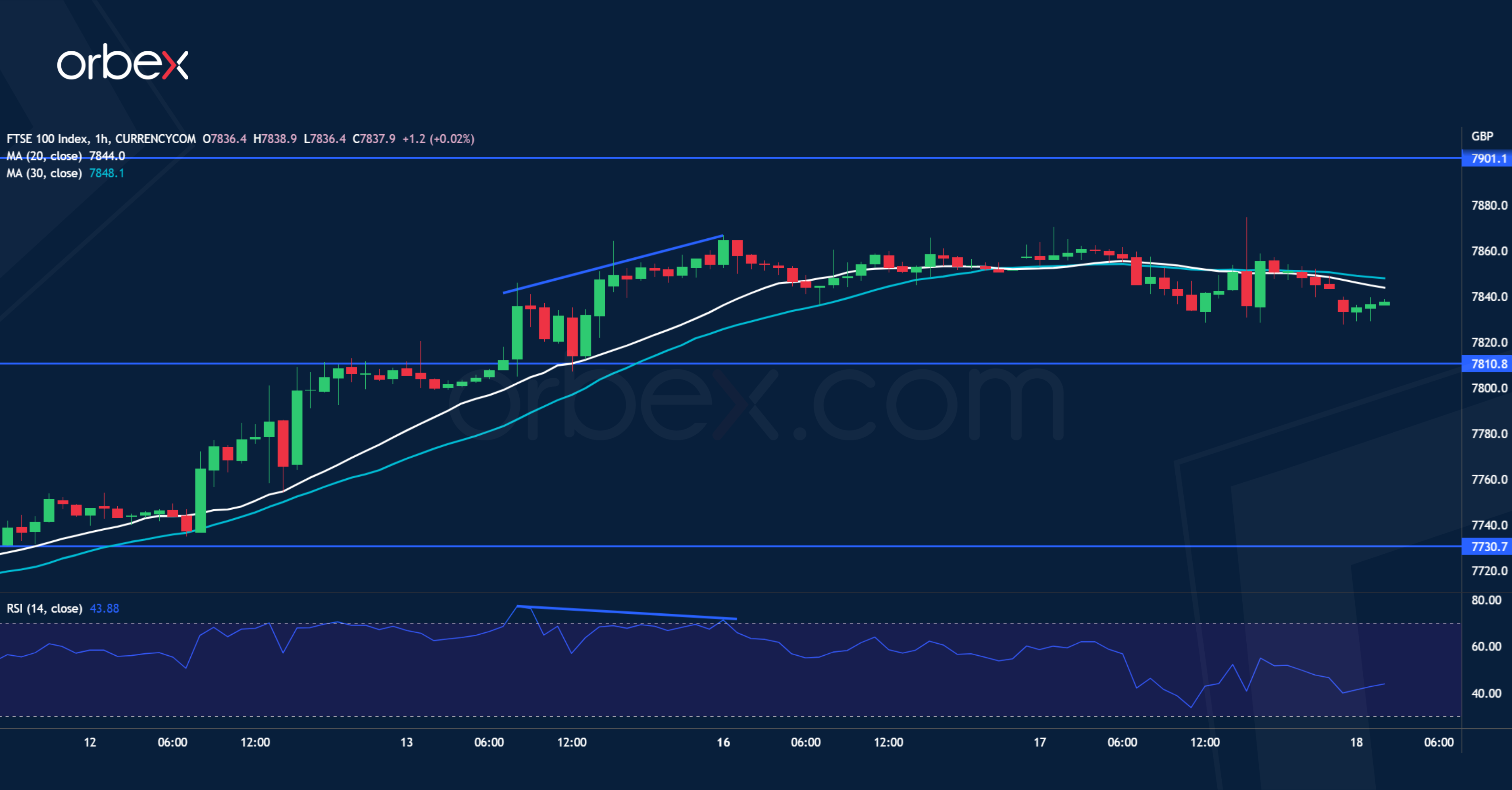 يرتفع مؤشر “فوتسي ١٠” مع ارتفاع الأسهم المالية. وقد تحرك المؤشر بشكل مثالي على الرسم البياني اليومي، بعدما تجاوز قمة العام الماضي عند ٧٦٧٠. هذا وقد تبطئ القمة المزدوجة لمؤشر القوة النسبية في منطقة ذروة الشراء من الزخم. ويدعم تباين مؤشر القوة النسبية السلبي على الرسم البياني للساعة احتمالية الضعف. ويعد المستوى ٧٨١٠ الدعم الأول لتحديد ما إذا كان بإمكان المشترين الحفاظ على العروض الخاصة بهم عند هذه المستويات المرتفعة الجديدة، ودفع المؤشر نحو ٧٩٠٠ من عدمه. كما من شأن الكسر السلبي أن يدفع نحو عمليات جني أرباح أوسع نطاقاً، وربما يعني هذا عودة المؤشر نحو المستوى ٧٧٣٠.