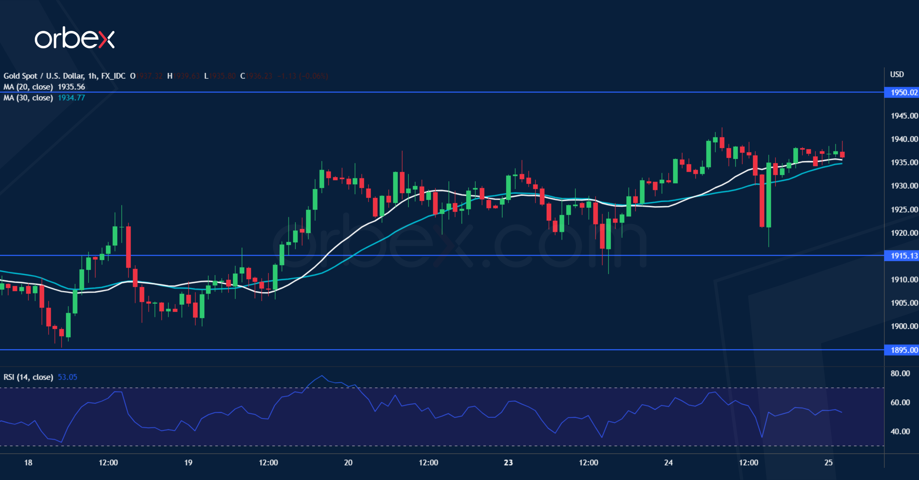 تراجعت أسعار الذهب بعد أن ساهم ارتفاع عائد السندات في ارتفاع الدولار الأمريكي. ويوضح الرسم البياني اليومي، هيمنة السعر على منطقة بيع أبريل الماضي قرب ١٩٣٠، والتي تفسح الطريق لاستهداف ١٩٩٥. وهو الخط الفاصل بين الصعود والهبوط، حيث عوض الذهب خسائره التي مني بها بعد تراجع دام لستة أشهر. وعلى الرغم من تقلب حركة السعر، فإن مسار الذهب بشكل عام يميل للصعود. وبالتالي قد ينظر أتباع الاتجاه لأي تراجع في الاسعار على إنه فرصة للشراء. وفي حين أن ١٩١٥ هو أقرب دعم، فإن من شأن الإغلاق أعلى ١٩٥٠، أن يمهد الطريق لصعود الذهب نحو ١٩٧٥.