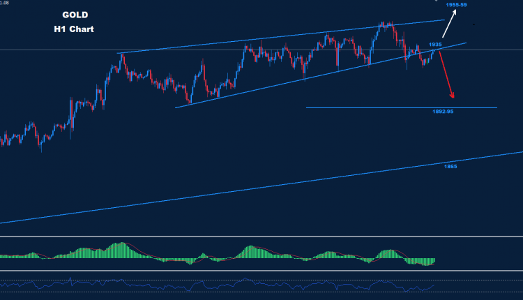 تمكن الذهب من التراجع تحت مستويات الدعم لتشكيل الوتد الصاعد مع استمرار التداولات فوق مستوى الدعم الأول لمناطق 1919