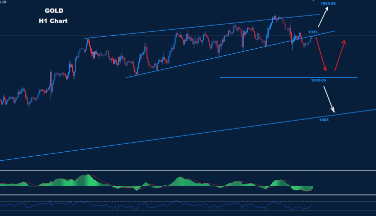 تمكن الذهب من الانخفاض تحت خط الدعم لنمط الوتد الصاعد مع استمرار التداولات فوق مستوى الدعم الأول لمستويات 1916.