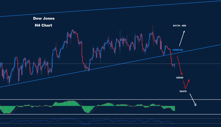 تمكن مؤشر داو جونز من الانخفاض دون مستوى الدعم 33470 مع إغلاق يومي الثلاثاء الماضي.