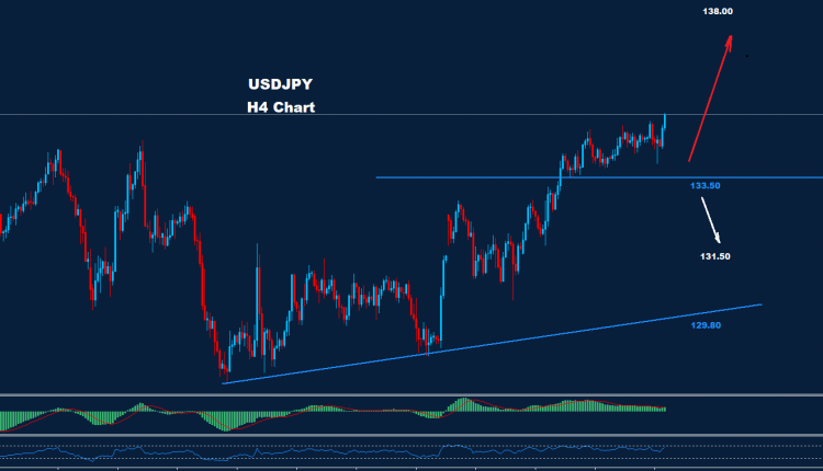 تمكن الدولار الأميركي مقابل الين الياباني من التقدم فوق المقاومة 134.75 عدة مرات مما قد يكون إشارة إلى تقدم أبعد قادم.