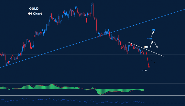 فوق 1835 فإن المزيد من التقدم قد يضرب السوق حيث سيواجه الذهب مقاومات حول 1848 و1870.