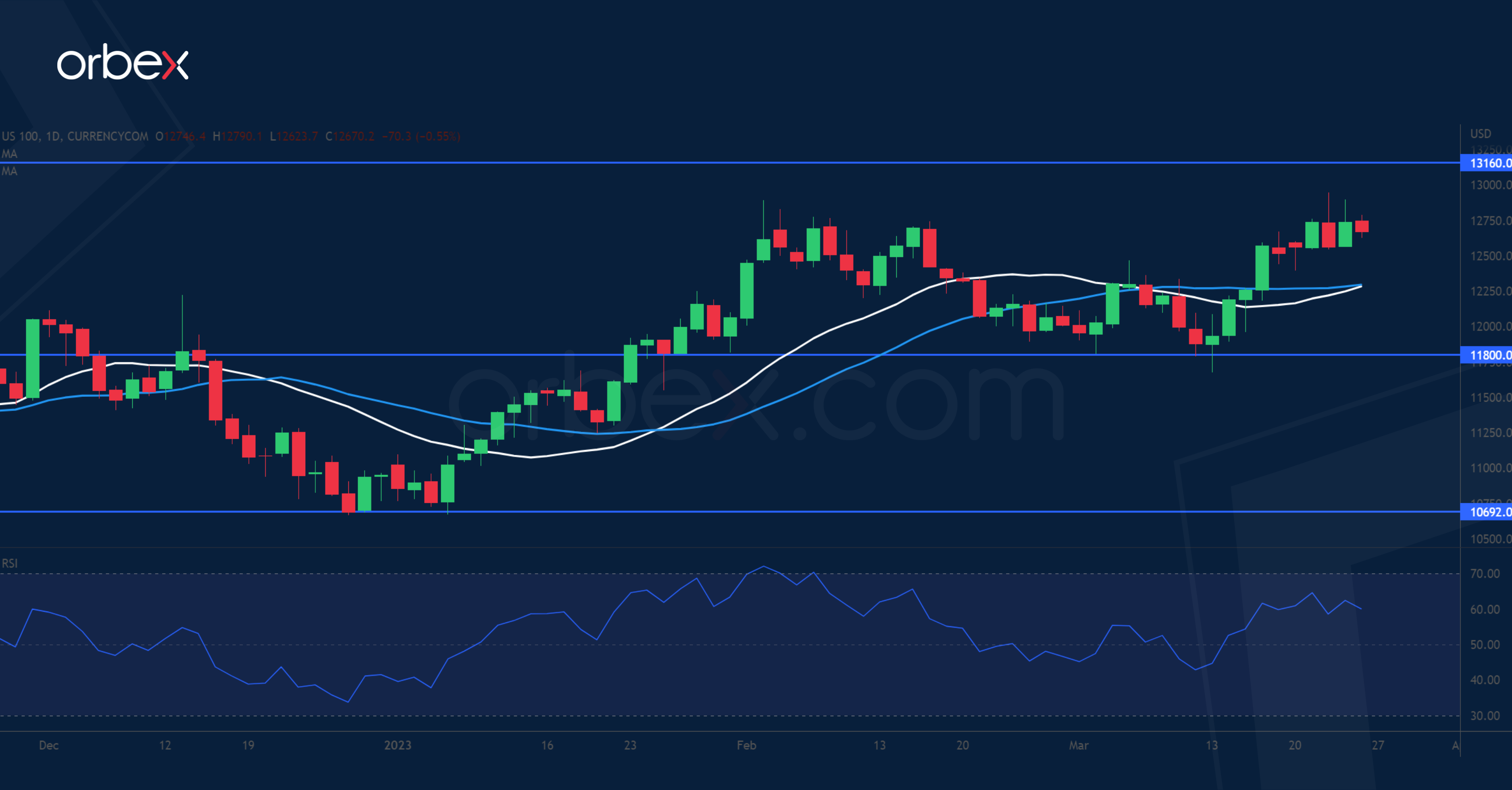 يعاني مؤشر “ناسداك ١٠٠” في ظل قلق المستثمرين بشأن توقعات سياسة بنك الاحتياطي الفيدرالي. وفي حين أكد باول مجدداً إمكانية زيادة أسعار الفائدة بشكل أكبر، لا يزال يأمل المتداولون في أن تظهر البيانات القادمة أن الارتفاعات القوية قد خلفت أثراً على الاستهلاك. وحتى ذلك الحين، فإن تطمينات وزيرة الخزانة جانيت يلين بضمان الودائع المصرفية في خضم الأزمة المصرفية ستمنح الاحتياطي الفيدرالي مطلق الحرية للتركيز على التضخم، وعلى وجه التحديد رفع أسعار الفائدة أكثر إذا ما لزم الأمر وتحجيم التكهنات بشأن خفض أسعار الفائدة هذا العام. وفيما يختبر المؤشر منطقة العرض القريبة من ١٣١٦٠، ويبقى ١١٨٠٠ يمثل دعماً رئيسياً.