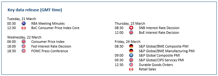 يشهد الدولار الأمريكي تقلبات حادة في الأسعار أمام الفرنك السويسري مع إعادة تسعير المتداولين مقدار رفع أسعار الفائدة وسط حالة عدم الاستقرار المالي. وإلى الآن كانت التوجيهات السياسة معتمدة على نتائج البيانات، أكثر من اعتمادها على أخبار القطاع المصرفي التي تصدرت العناوين مؤخراً، وهو ما من شأنه أن يجعل نتيجة بنك الاحتياطي الفيدرالي تقابل أي تخمين. ومع تطور الأحداث خلال فترة التعتيم الخاصة بالبنك المركزي، يزداد القلق تزامناً مع التقلبات حيث لا أحد يريد أن يظهر على الجانب الخطأ يوم الأربعاء. فهل سيتراجع “باول“ وأعضاء الفيدرالي؟ قد يهدئ تحول الفيدرالي لنبرة ميسرة من روع الأسواق، لكن التعنت في الموقف المتشدد من شأنه أن يزيد من توجه المتداولون نحو الأمان ويصعد بالدولار الأمريكي أعلى ٠.٩٤٣٠. أما آخر قاع سجله الزوج فيقع عند ٠.٩٠٥٠.