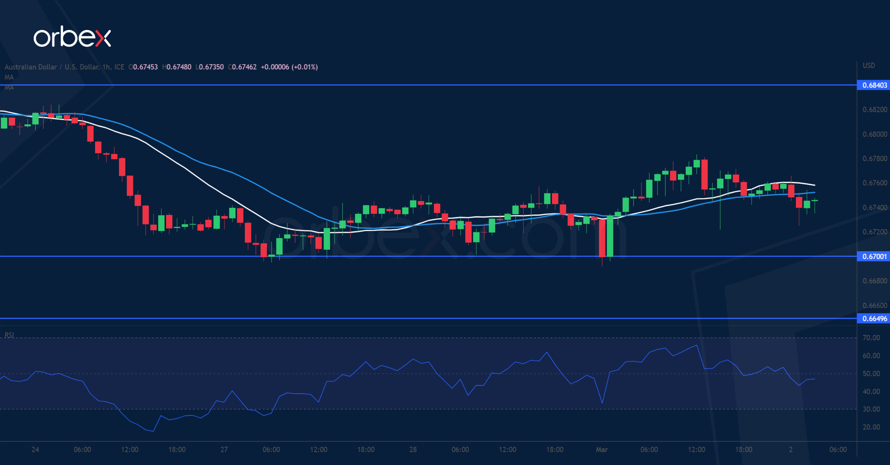 رغم توقف ارتفاع الدولار الأسترالي في أعقاب تباطؤ نمو الناتج الإجمالي المحلي في الربع الرابع، يبدو أن حركة السعر قد نجحت في تأمين قاعدة لها في منطقة الطلب الممتدة بين ٠.٦٦٥٠ و٠.٦٧٠٠ والواقعة بجوار قاع التأرجح في ديسمبر. والتي تعد منطقة رئيسية يستطيع المشترين من خلالها العودة للنضال من أجل الحفاظ على الاتجاه الصاعد على المدى المتوسط، إذ أن الاختراق السلبي قد يفضي لحدوث انعكاس. وتقع المقاومة الأولى على الرسم البياني للساعة عند ٠.٦٨٤٠، ومن شأن النجاح في اختراقها أن يقلص من ضغط البيع. وفي حال نجح الزوج في تحقيق مزيد من الارتفاع، فإن المستوى ٠.٦٩٣٠ يعد هو الحد الأعلى الذي يتعين تجاوزه قبل أن يتشكل انتعاش أوسع نطاقاً.