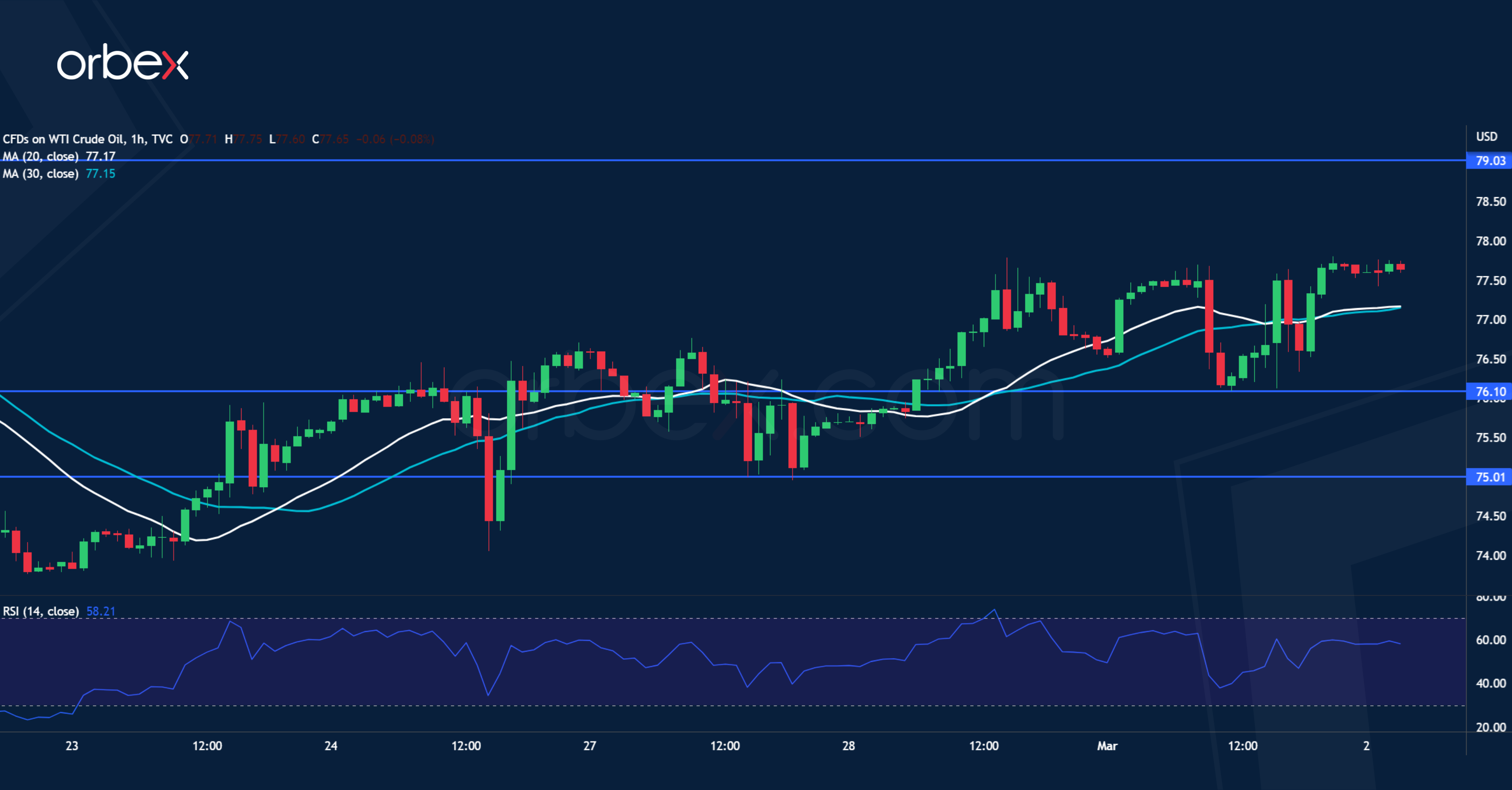 ارتفع خام غرب تكساس الوسيط بعد أن زادت أرقام مؤشر مديري المشتريات الصيني والتي فاقت التوقعات من توقعات الطلب. ولا يزال السعر على الرسم البياني اليومي يتداول ضمن نطاق المستويين ٧٢.٥٠ و٨٢.٢٠. وبعد انسحاب البائعين في أعقاب تمكن النفط من الارتفاع أعلى ٧٧.٥٠، أصبح الطريق ممهداً لرحلة ارتداد أخرى يكون فيها المستوى ٧٩.٠٠ هو الهدف التالي. وقد يسهم الزخم الإيجابي القوي في عودة السلعة إلى القمة الأخيرة عند ٨٠.٥٠. وفي حال تراجع النفط، فإن ٧٦.١٠ سيكون هو الدعم الذي تقيّيم عنده قوة طلبات المتابعة، أما المستوى الرئيسي الذي يتعين صموده للإبقاء على التحيز الإيجابي قائماً على المدى القصير، فيقع عند ٧٥.٠٠.