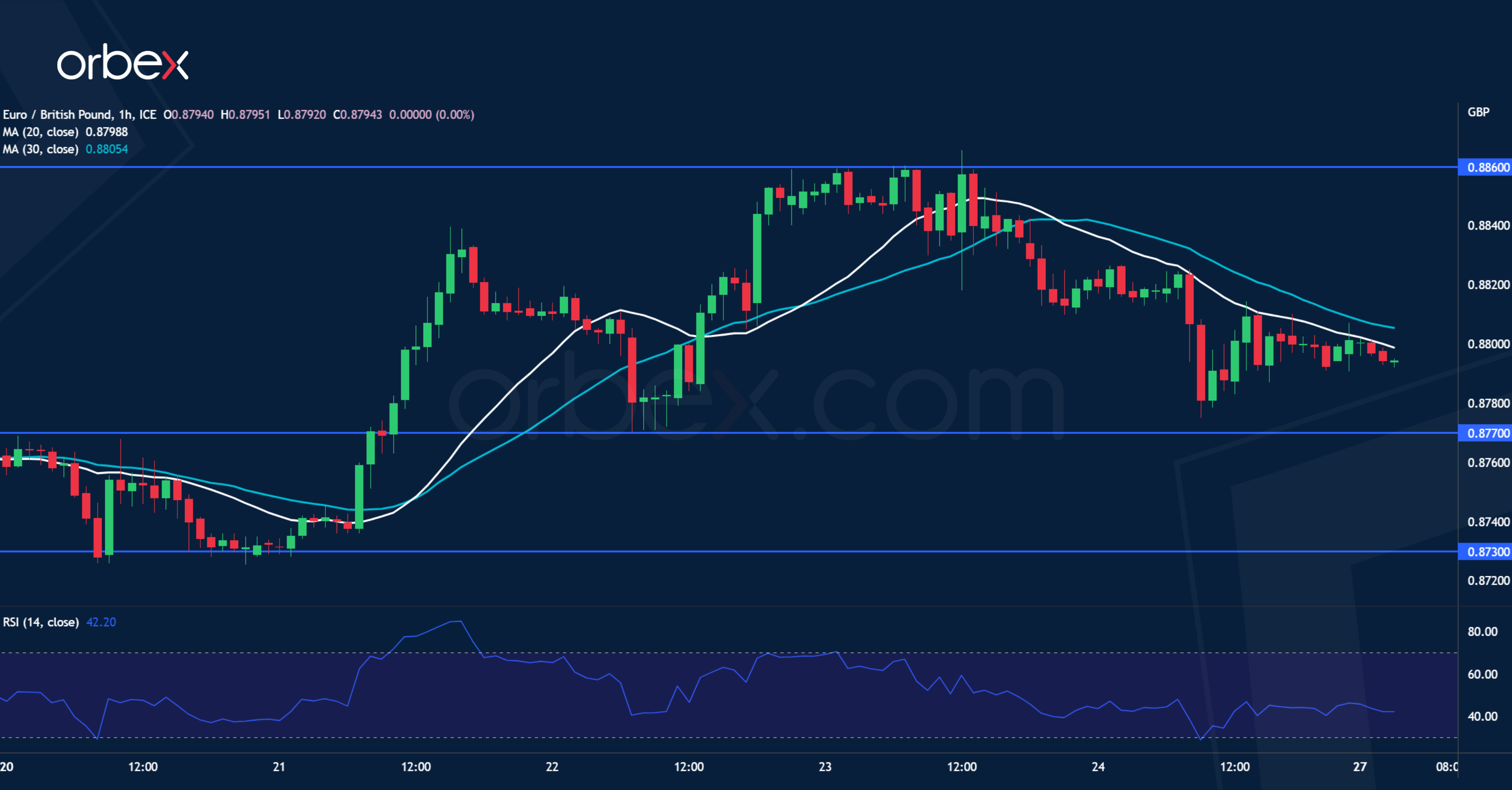 انخفض اليورو مقابل الجنيه الإسترليني بعد أن أثر تراجع أسهم البنوك الأوروبية على المعنويات. وأدى الانخفاض دون مستوى الدعم الأول عند ٠.٨٨١٠ إلى تراجع الزخم الإيجابي. وعليه، يعتبر ٠.٨٧٧٠ هو المستوى التالي لمعرفة ما إذا كان المشترون سيتمكنون من الحفاظ على الارتداد الأخير قائماً، أو سيصبحون في موقف صعب إذا ما عاد الزوج إلى الدعم الجوهري عند ٠.٨٧٣٠. والذي من شأن كسره أن يرسي الأساس لانعكاس سلبي على المدى المتوسط. وقد اجتذبت حالة ذروة البيع لمؤشر القوة النسبية بعض متصيدي الصفقات، ويعتبر الإغلاق أعلى ٠.٨٨٦٠ هو بوابه وصول الزوج إلى قمة هذا الشهر عند ٠.٨٩٢٠.