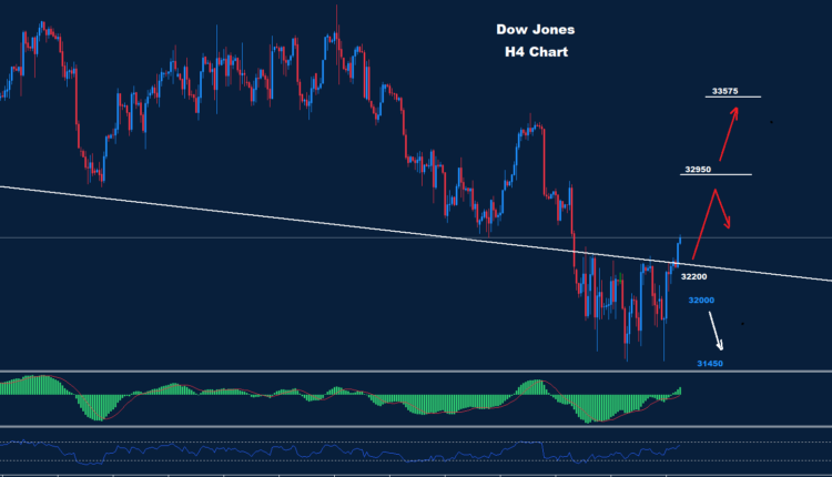 تمكن مؤشر الداو من التقدم فوق مقاومة الترند الهبوطي، بينما تمكن أيضاً من الوصول فوق المقاومة 32450.