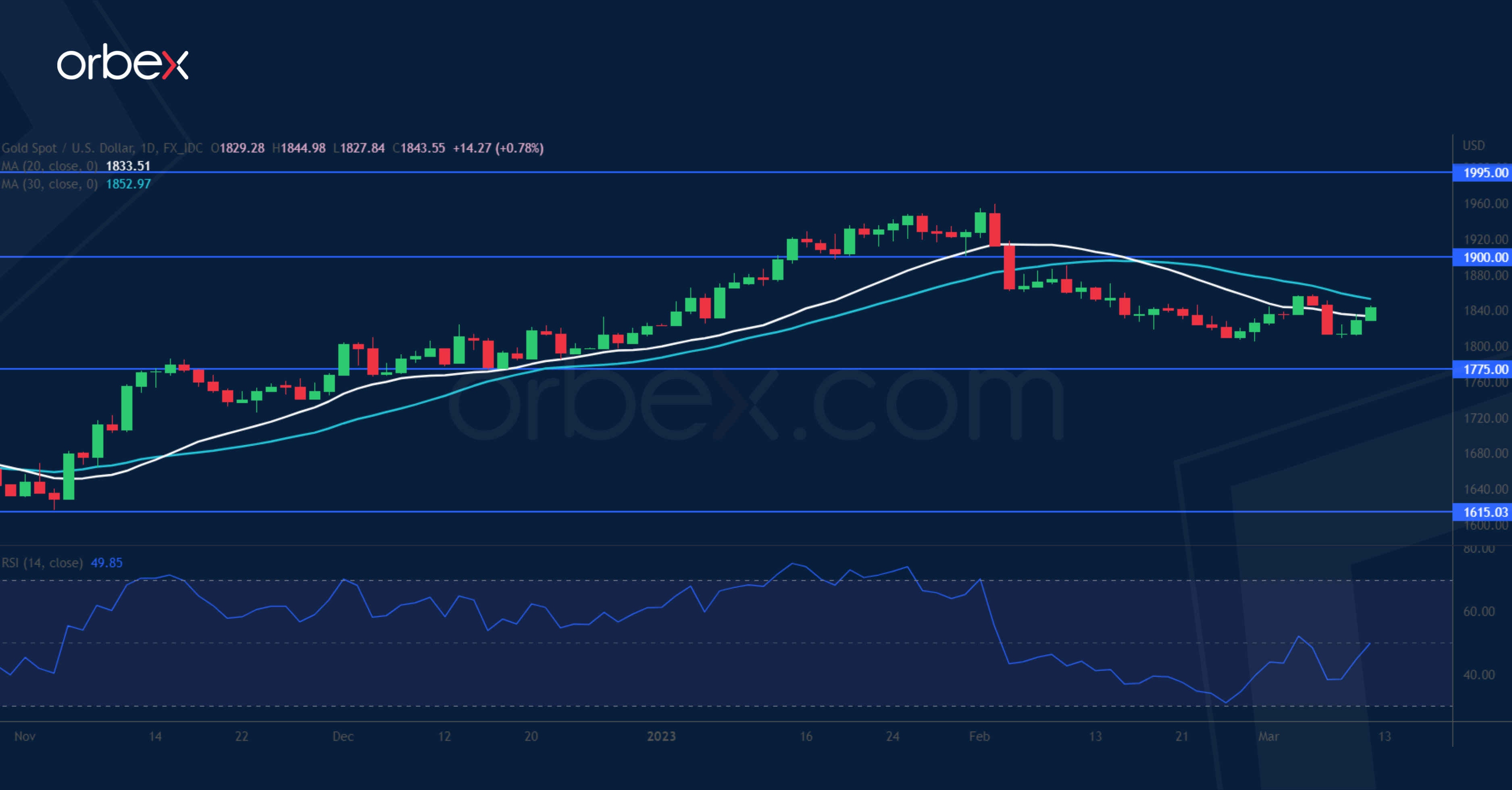 يعاني الذهب مع استمرار ارتفاع عوائد السندات وسط حالة عدم اليقين بشأن النقطة المحورية لبنك الاحتياطي الفيدرالي. وقد أثارت نتائج البيانات الاقتصادية القوية في الولايات المتحدة في الأسابيع الأخيرة مخاوف من عودة صناع السياسة إلى مقاعدهم المتشددة. ومع وصول مؤشر الدولار إلى أعلى مستوى له في ثلاثة أشهر، فإن أداء المعدن الثمين يسير بشكل عكسي لأداء الدولار. ومع تزايد التكهنات بشأن سعر الفائدة النهائي وسط محادثات بنسبة ٥٪ أو حتى ٦٪، فعندما يتعلق الأمر بتوزيع أصول المستثمرين، فإن المعدن الذي لا ينطوي على فوائد يبدو باهتاً أمام الفرصة البديلة ذات الفائدة المرتفعة. واتساع نطاق ارتفاع الدولار الأمريكي من شأنه أن يزيد من الضغوط على الطلب على الذهب. والآن يقع الدعم الأقرب عند ١٧٧٥، ومستوى المقاومة الجديد عند ١٩٠٠.