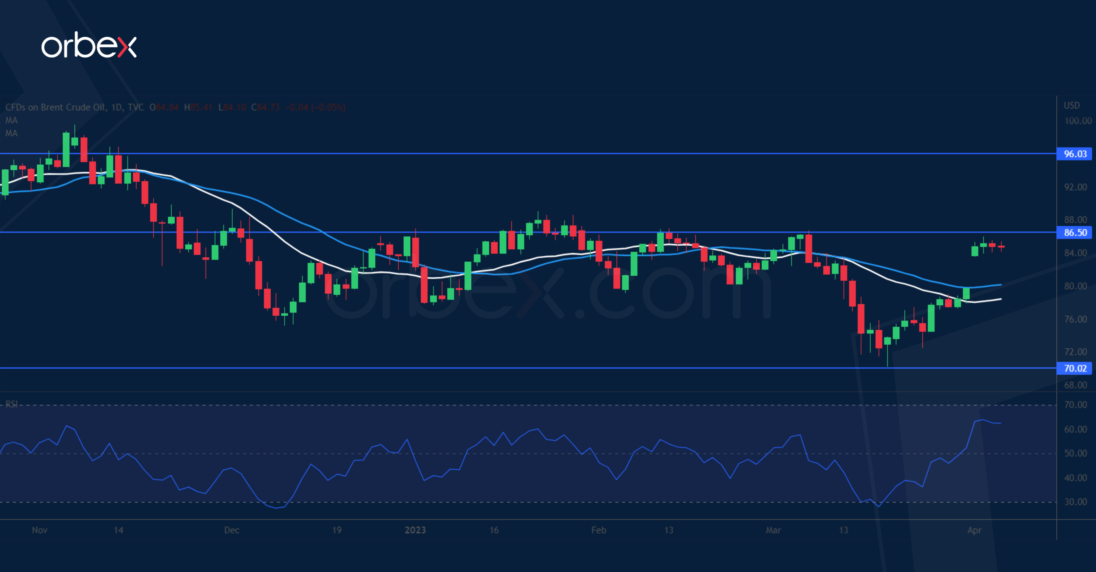 ارتد خام برنت من جديد بعد التخفيضات الإضافية للإنتاج. ويحاول السوق إيجاد نوع من التوازن بين حذره بشأن الآفاق الاقتصادية ونمو العرض المحدود. ومن خلال الإعلان عن خفض الإنتاج علاوة على القيود المفروضة حالياً، يحاول أعضاء منظمة أوبك+ استعادة زمام المبادرة في بيئة سوق قاتمة إلى حد ما. ومن شأن تقرير إدارة معلومات الطاقة الذي يظهر انخفاضاً في مخزونات الولايات المتحدة أن يؤدي إلى تفاقم الشعور بتقلص العرض وتعزيز الاتجاه الصاعد. إلا أن النشاط الصناعي الهزيل في الولايات المتحدة والصين والمعنويات الحذرة بشكل عام قد تحد من التفاؤل. وأصبح ٧٠.٠٠ دعم فعال في حين يختبر السعر العقبة الأولى عند ٨٦.٥٠.