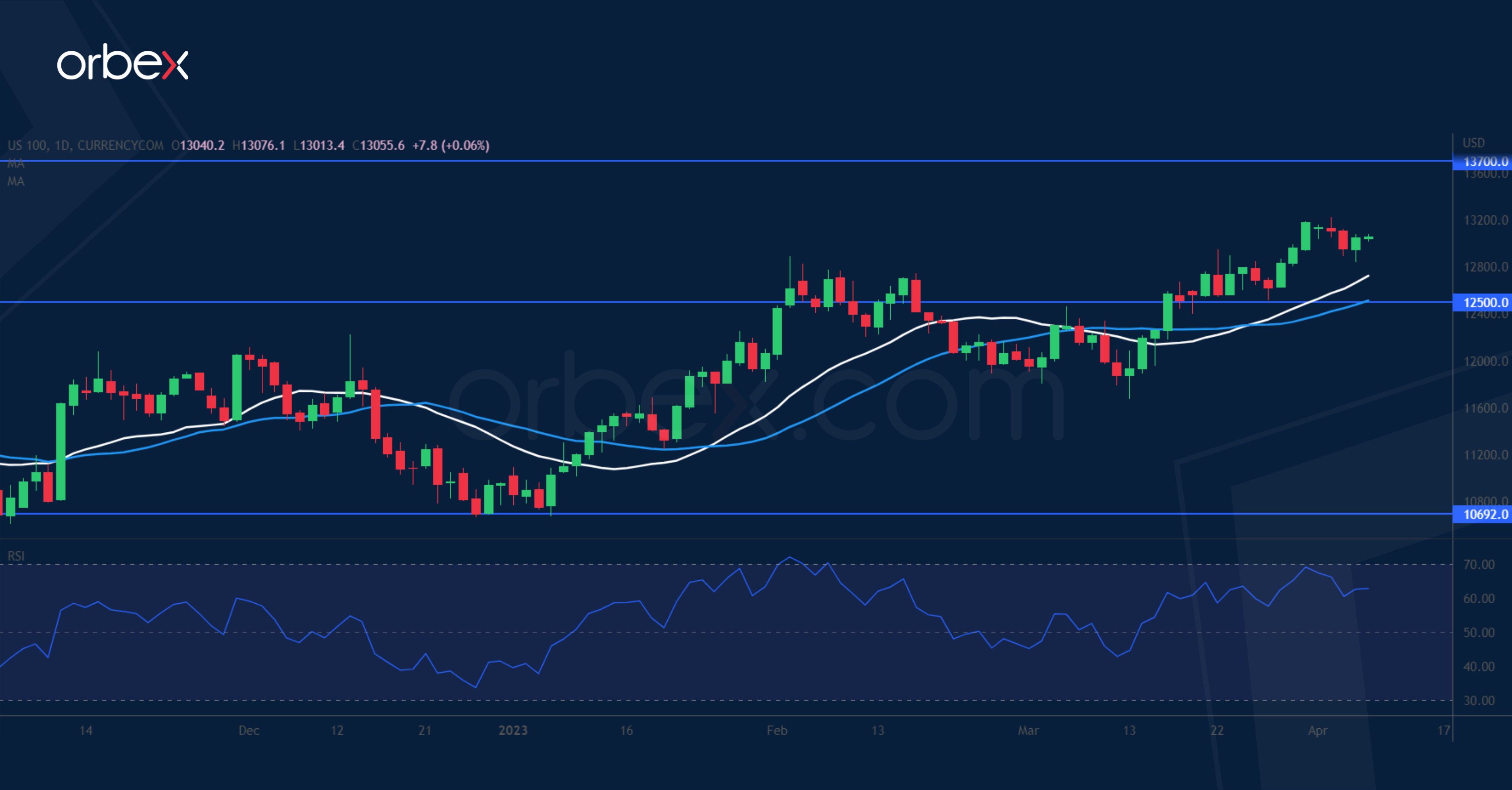 يرتفع مؤشر “ناسداك ١٠٠” حيث تدل البيانات الاقتصادية الضعيفة على تحول الاحتياطي الفيدرالي. وتقيم السوق دلالات متزايدة على تباطؤ الاقتصاد الأمريكي مدفوعاً بحملة تشديد عنيفة. وقد أظهرت البيانات الحديثة أن ارتفاع الأسعار له نتائج إيجابية مع نشاط الصناعة الضعيف وسوق العمل الفاتر. بيد إن التضخم المرتفع لمستويات لم يصلها من عقود سيستغرق بعض الوقت حتى ينخفض، وهذا من شأنه أن يجعل المستثمرين يتساءلون متى سيرسم بنك الاحتياطي الفيدرالي خطاً فاصلاً ويبدأ التحول. قد تتعارض حركة السعر مع الخوف من الركود، لكن الأمل في خفض سعر الفائدة بحلول الصيف هو الذي يقود الزخم. ويعد ١٣٧٠٠ هو الهدف التالي، فيما يعتبر ١٢٥٠٠ مستوى دعم.