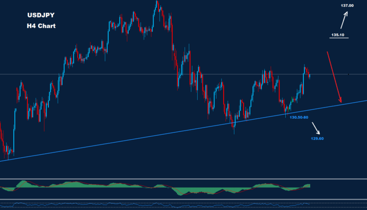 بينما طالما استمر السوق في الاحتفاظ بالتداولات دون المقاومة الثانية 135.10، فإن التصحيح الهبوطي نحو 131.20 سيكون متوقعاً.