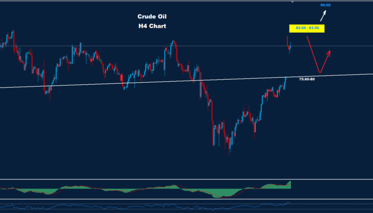 تمكن النفط الخام من الاحتفاظ بالتداولات تحت منطقة المقاومة على المدى القصير 82.60 – 83.50 حيث تمكن من التوجه لتصحيح هبوطي لتغطية فجوة سعر السوق مع الاقتراب من الدعم 80-75.60 كما نرى