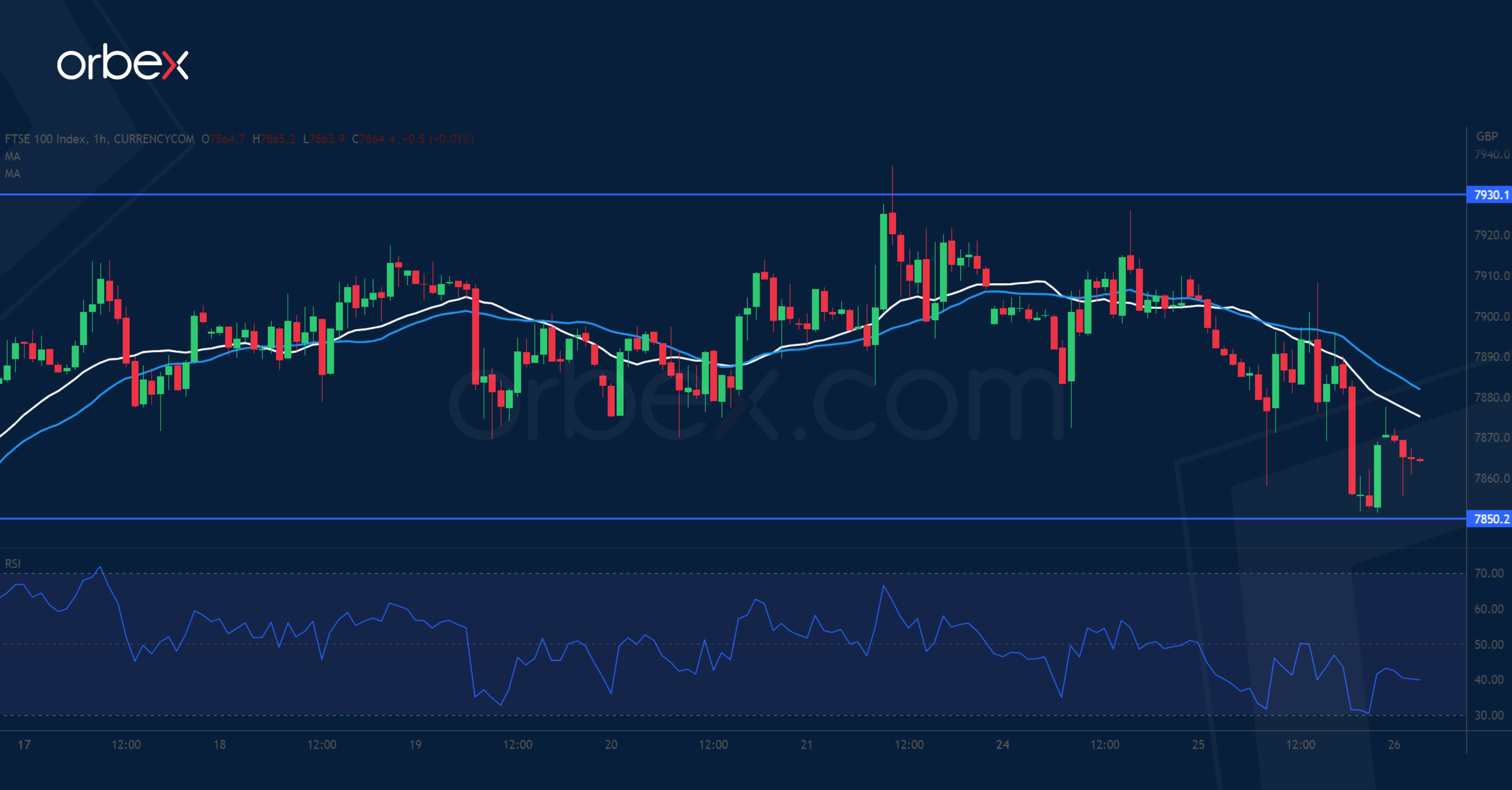 تراجع مؤشر فوتسي ١٠٠” بعد تجدد المخاوف بشأن القطاع المصرفي نتيجة تراجع الودائع في بنك “فيرست ريبابليك”. وقد أعاد الارتفاع على شكل حرف (V) المؤشر قرب قمة هذا العام، حيث كانت منطقة العرض الواقعة بين ٧٩٣٠ و٧٩٧٠ المعقل الأخير للبائعين. وسيتأكد استمرار الصعود واستهداف مستوى تاريخي جديد أعلى ٨٠٤٠ مع الاختراق الصاعد. إلا أن المشترين سيكونون بحاجة لإستجماع قواهم وتعزيز مكاسبهم. وسيكون المستوى ٧٨٥٠ أول من يقيم عنده الرغبة في المتابعة مع اتجاه السعر أفقيًا. وفي حال امتد نطاق التصحيح، فسيتم اختبار المستوى ٧٧٧٥ على المتوسط المتحرك البسيط لمدة ٢٠ يومًا.