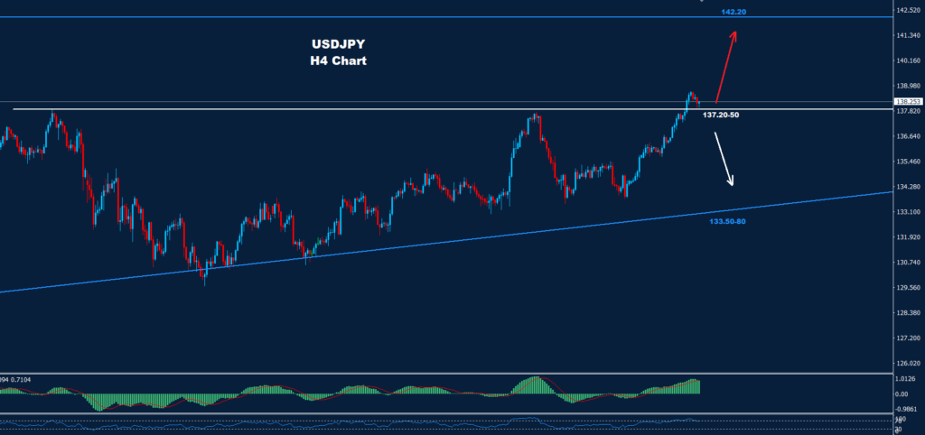 كما نرى على الرسم البياني، يبدأ الدعم خلال اليوم من 50-137.20 حيث طالما استمر السوق في الاحتفاظ بالتداولات فوق هذه المنطقة، فمن المتوقع حدوث المزيد من التقدم حيث توجد المقاومة عند 139.90 و142.20.
