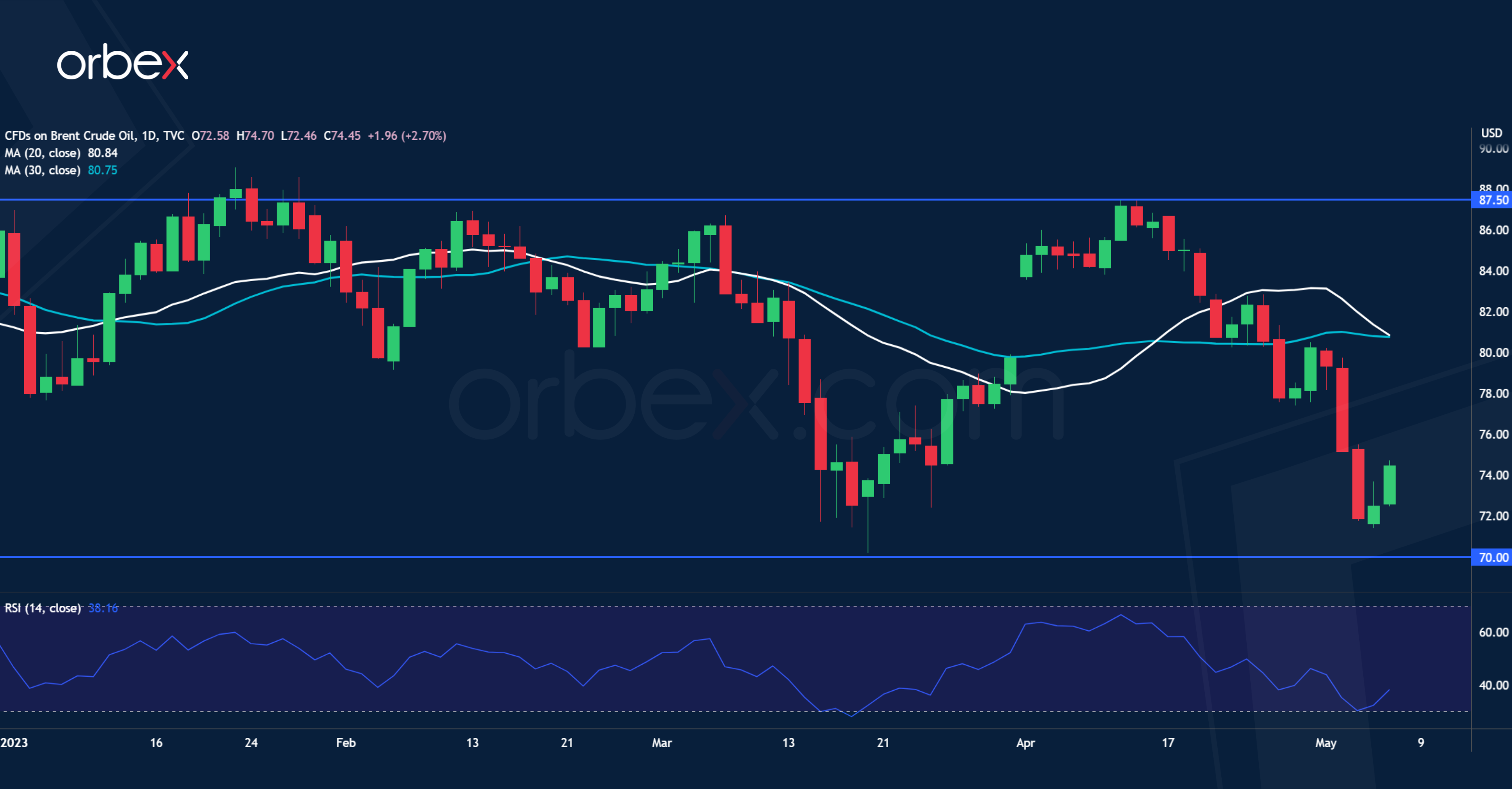 تبقي المخاوف إزاء ضعف الطلب العالمي أسعار النفط تحت الضغط. وفي ظل التوتر الحذر السائد في السوق، قام المستثمرون بتقليص تعرضهم للأصول مرتفعة المخاطر. ولم تترك الرياح العاصفة القوية التي تأتي من الولايات المتحدة والصين شهية تذكر لتداول السلعة المرتبطة بالنمو. وما لم تُطفأ شرارة البنوك الإقليمية الأمريكية المتعثرة نهائياً، فمن غير المرجح أن يعود التفاؤل، حيث أن آخر ما يرغب السوق في رؤيته هو تحول الأزمة لكارثة. وفي غضون ذلك، أظهر نشاط المصانع الصينية انكماشاً في أبريل، ليشكل ضغطاً مزدوجاً على سعر النفط الذي يختبر مستوى ٧٠.٠٠، فيما تقع المقاومة القوية عند ٨٧.٥٠.