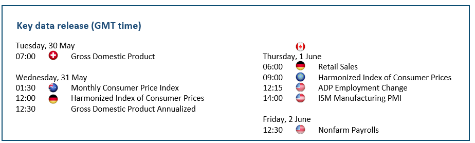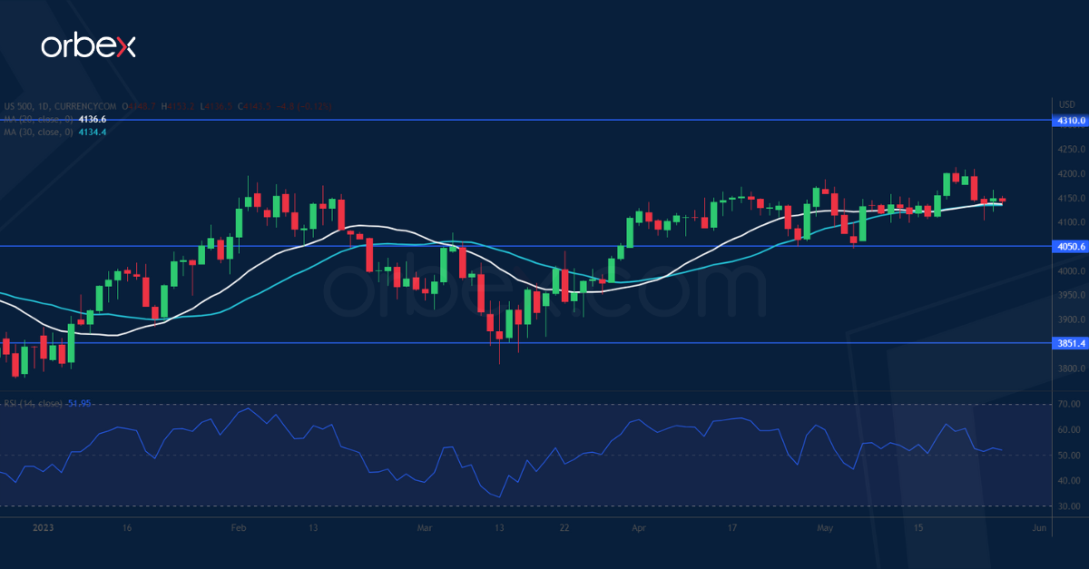 أوقف مؤشر “ستاندرد أند بورز ٥٠٠” تقدمه مع عدم وضوح الرؤية في السوق نتيجة. عدم اليقين الاقتصادي والجيوسياسي. وتعد توقعات رفع الأسعار مرتفعة إلى حد ما حيث تشير الأصوات إلى أن تعليق رفع الفائدة قد لا يعني نهاية دورة التشديد، ويتوقع السوق بنسبة الثلث فرصة حدوث زيادة قدرها ٢٥ نقطة أساس في يونيو. ومن ناحية أخرى، ونظراً لأن الموعد النهائي المحدد لسقف الدين المحدد ففي 1 يونيو لم يكن كافياً لإبقاء المستثمرين على أهبة الاستعداد، فإن تدهور العلاقات التجارية بين الولايات المتحدة والصين زاد من عدم اليقين لتسعير الأصول الخطرة ووفر للبائعين ذريعة لبيع الارتداد. وفيما يقع الدعم الأقرب عند ٤٠٥٠، يمثل المستوى ٤٣١٠ المقاومة المقبلة.