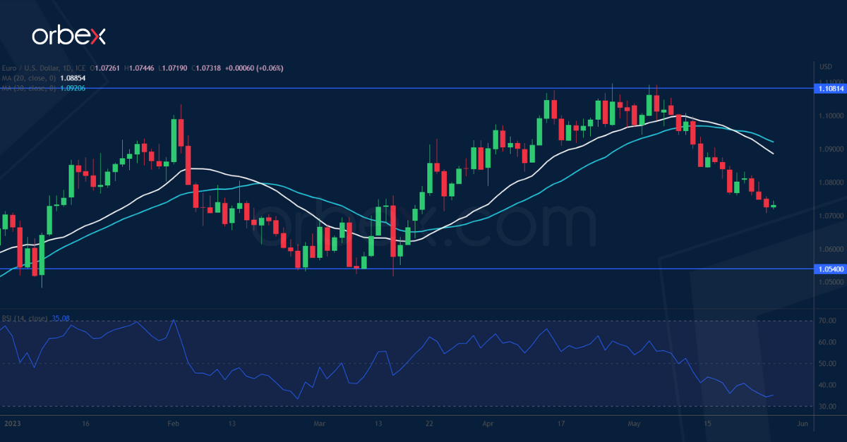 يتراجع اليورو مقابل الدولار الأمريكي مع احتمالية اقتراب البنك المركزي الأوروبي من نهاية دورة رفع الفائدة. إذ ألمح بعض صناع السياسة إلى بلوغ ذروة سعر الفائدة بحلول نهاية الصيف بعد ارتفاع حاد بلغ ٣٧٥ نقطة أساس خلال الأشهر العشرة الماضية. على غرار رد فعل السوق تجاه نقطة تحول الاحتياطي الفيدرالي الأمريكي، تحول تركيز المتداولين إلى مدة استمرار بقاء أسعار الفائدة مرتفعة. وقد تكشف بيانات التضخم المقبلة عن تأثير تلك الزيادات وتؤثر على التوازن المالي والاقتصادي. وفي الوقت نفسه، قد يضعف تباين السياسات بين البنوك المركزية المذكورة حماس المستثمرين بشأن العملة الموحدة. وفيما يتجه الزوج نحو ١.٠٥٤٠، يعتبر ١.١٠٨٠ مستوى مقاومة جديد.