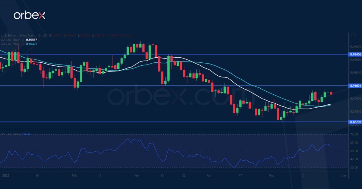 يعوض الدولار الأمريكي بعض الخسائر التي مني بها مقابل الفرنك السويسري حيث لم تنته حملة الاحتياطي الفيدرالي في تطبيع أسعار الفائدة بعد. وقد أبقت تصريحات المسؤولين المتشددة بين الحين والآخر والتي تشدد على حاجة البنك المركزي للمضي قدماً في تشديد السياسة النقدية مشترين الدولار متفائلين. وصرّح رئيس فرع مينيا بوليس للبنك المركزي الأمريكي نيل كاشكاري أحد داعمي التشديد، أنه قد يتعين أن تصل الفائدة إلى ٦٪ لإجبار التضخم على العودة إلى نسبة الاحتياطي المستهدفة والبالغة ٢٪. وفي حين لا يزال النطاق محل جدل، إلا أن التوجه الواضح نحو زيادة أسعار الفائدة قد يساعد الدولار على التعافي حيث قد يكون السوق قد بلغ ذروة البيع عند تسعير الذروة التي ستتغير عندها السياسة النقدية. وفي حين يمثل ٠.٩١٠٠ أقرب مستوى مقاومة، يعد ٠.٨٨٢٠ الحد الأدنى الواجب صموده للحفاظ على استقرار الزوج.
