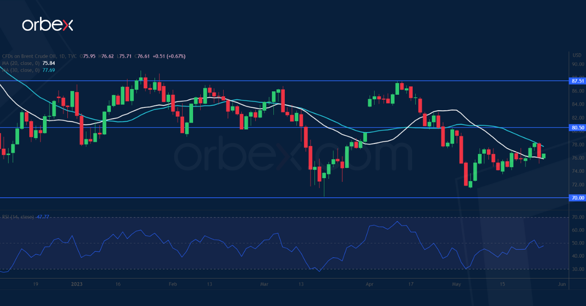 يستقر خام برنت مع انتظار السوق للخطوة التالية من قبل المنتجين في اجتماع سياسة أوبك+ القادم. وقد اعتبر تحذير وزير الطاقة السعودي من بيع كميات كبيرة من النفط مؤشراً على مزيد من الخفض في الانتاج في الاجتماع الذي سيعقد في ٤ يونيو، مما دفع العروض للارتفاع في هذه المرحلة. ومن ناحية الطلب، قد تشكل المفاوضات الخاصة بسقف الدين الأمريكي عقبة مؤقتة، ومن شأن التوصل إلى اتفاق محتمل قريباً أن تزيد التفاؤل الذي تشتد الحاجة إليه في سوق متدهورة إلى حد ما. من الناحية الأساسية، فإن البيانات القوية من الولايات المتحدة ستخفف مخاوف حدوث ركود اقتصادي أعمق. وتقع أولى مستويات المقاومة عند ٨٠.٥٠ التي يتوجب تخطيها، والمستوى النفسي ٧٠.٠٠ هو مستوى الدعم الرئيسي.