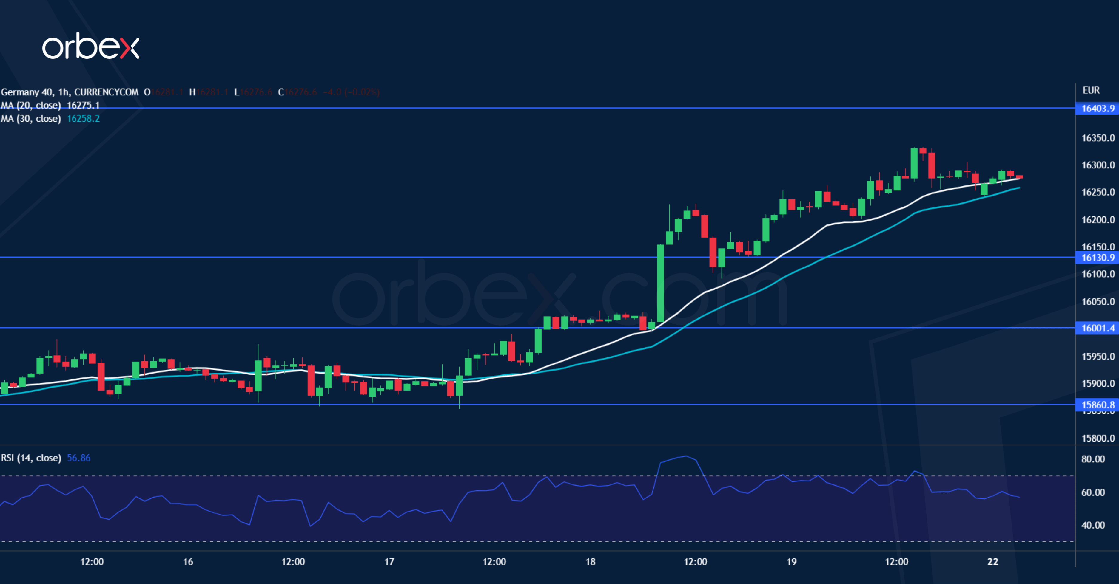 وصل مؤشر “داكس ٤٠” إلى ذروة جديدة بعد موسم أرباح قوي للشركات الأوروبية. ليرتفع معها المؤشر من جديد إلى أعلى مستوى له على الإطلاق عند ١٦٢٩٠، مما يشير إلى زخم قوي في الارتفاع لا نية للتراجع عنه. وأن المستوى ١٦٤٠٠ هو المستهدف التالي للمشترين. على الرغم من أن حالة ذروة الشراء لمؤشر القوة النسبية في منطقة العرض الكبيرة هذه قد تؤدي إلى تراجع إذا بدأ المشترون في جني بعض أرباحهم. وعندها سيكون ١٦١٣٠ هو الدعم الأقرب، بينما المستوى النفسي ومستوى المقاومة التي تحول إلى دعم ١٦٠٠٠ سيمثل خط الدفاع الثاني في حالة هبط المؤشر أكثر.