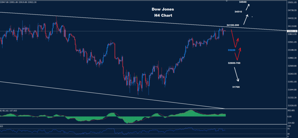 تمكن مؤشر الداو من تحقيق الهدف 33220 حيث تمكن من ضرب تصحيح ارتدادي آخر باتجاه منطقة المقاومة 200-34100 مرة أخرى.