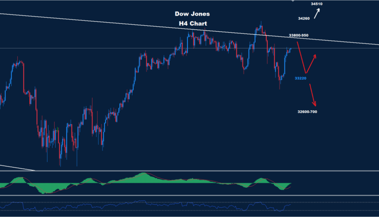 وطالما أن مؤشر داو جونز يحتفظ بالتداولات دون 950-33800، فإن موجة هبوط أخرى نحو الهدف الثاني 700-32600 لا تزال متوقعة.