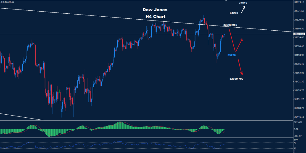 وطالما أن مؤشر داو جونز يحتفظ بالتداولات دون 950-33800، فإن موجة هبوط أخرى نحو الهدف الثاني 700-32600 لا تزال متوقعة.