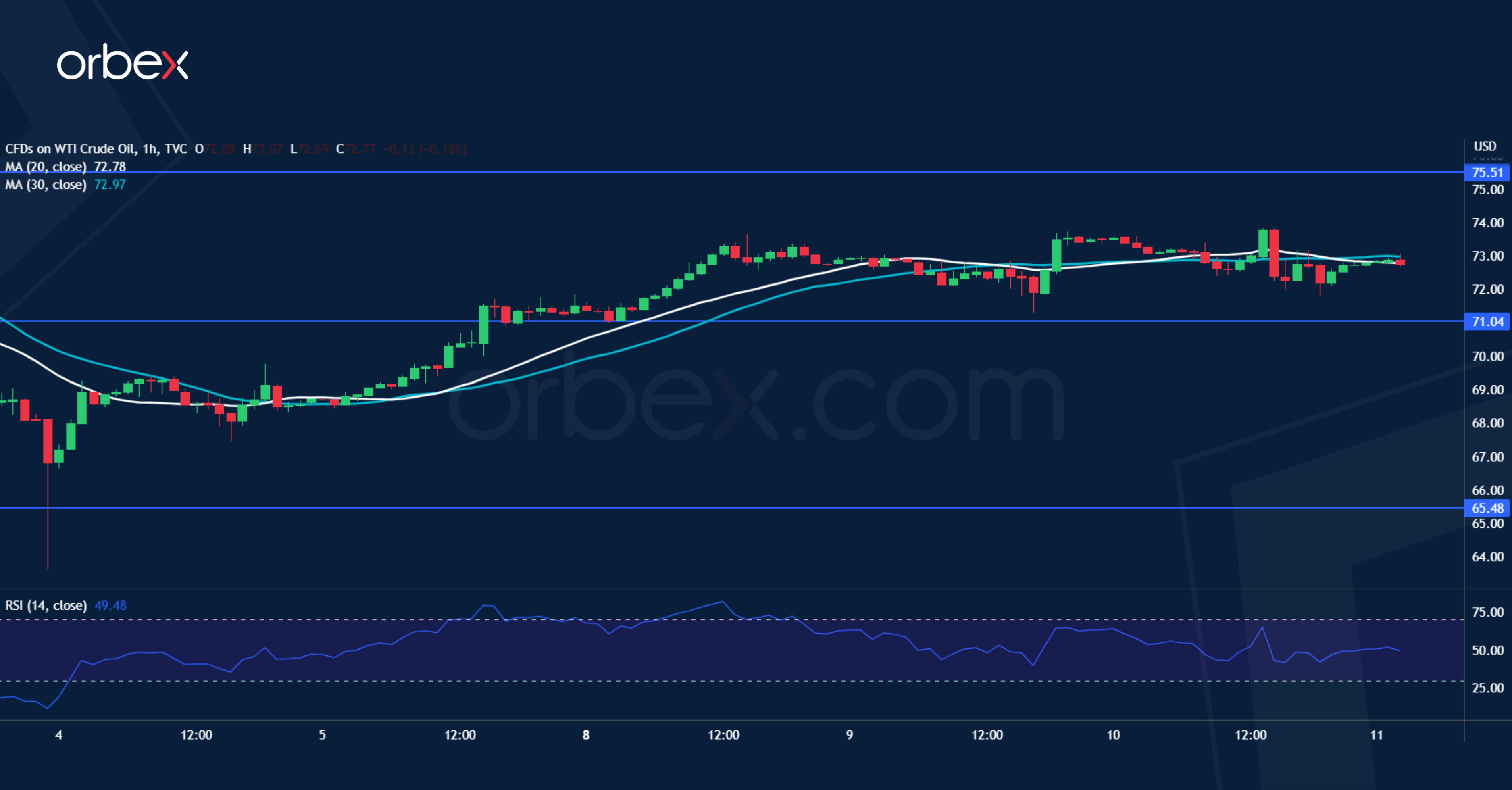 دفعت الزيادة المفاجئة في مخزونات الولايات المتحدة خام غرب تكساس الوسيط للانخفاض بعد أن تسببت الزيادة في إثارة المخاوف بشأن ضعف الطلب. ويدل التقاطع السلبي للمتوسط المتحرك على الرسم البياني اليومي على رغبة قوية بالبيع حيث فقد السعر مكاسبه الأخيرة. ويشير وجود فتيل طويل لشمعة دون مستوى الدعم اليومي ٦٥.٥٠ إلى رفض الاتجاه الهابط بعد أن أثار وجود مؤشر القوة النسبية في منطقة ذروة البيع سلوك “شراء الانخفاضات”. وتعد منطقة العرض بجوار المستوى ٧٥.٥٠ هي المنطقة التي سيقوم عندها البائعون بعقد صفقات البيع بقوة بسبب غياب القوة اللازمة للارتفاع. وسيمهد الانخفاض دون ٧١.٠٠ المجال لهبوط السعر للمستوى ٦٥.٥٠ من جديد، مما قد يعمق من خسائر النفط الأمريكي إلى المستوى ٦٠.٠٠.