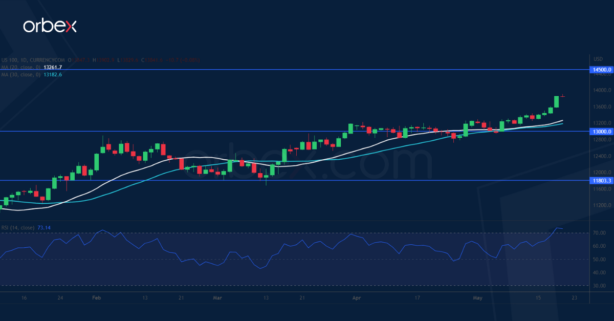 يتسارع ارتفاع مؤشر “ناسداك ١٠٠” بفضل تعزيز الأسس الاقتصادية الأمريكية القوية لرغبة المخاطرة لدى المستثمرين. وتبث تقارير الأرباح القوية من عمالقة التكنولوجيا بالإضافة إلى نتائج البيانات الاقتصادية الجيدة شعوراً بالاستقرار في السوق. الآن بعد أن بدأ الضغط المصرفي يتراجع، انتهز المشترين فرصة الهدوء النسبي للشراء. وفي الوقت نفسه، فإن الأصوات المتباينة داخل بنك الاحتياطي الفيدرالي بين داعمي التشديد وأولئك الذين يفضلون انتظار المزيد من البيانات قبل التوصل إلى قرار من شأنها أن تحبذ مبادرة الرئيس “جيروم باول“ لتعليق تشديد السياسة، وهو ما يقدم مزيد من الدعم للمؤشر الذي يتوجه نحو ١٤٥٠٠، فيما أصبح ١٣٠٠٠ مستوى دعم جديد.