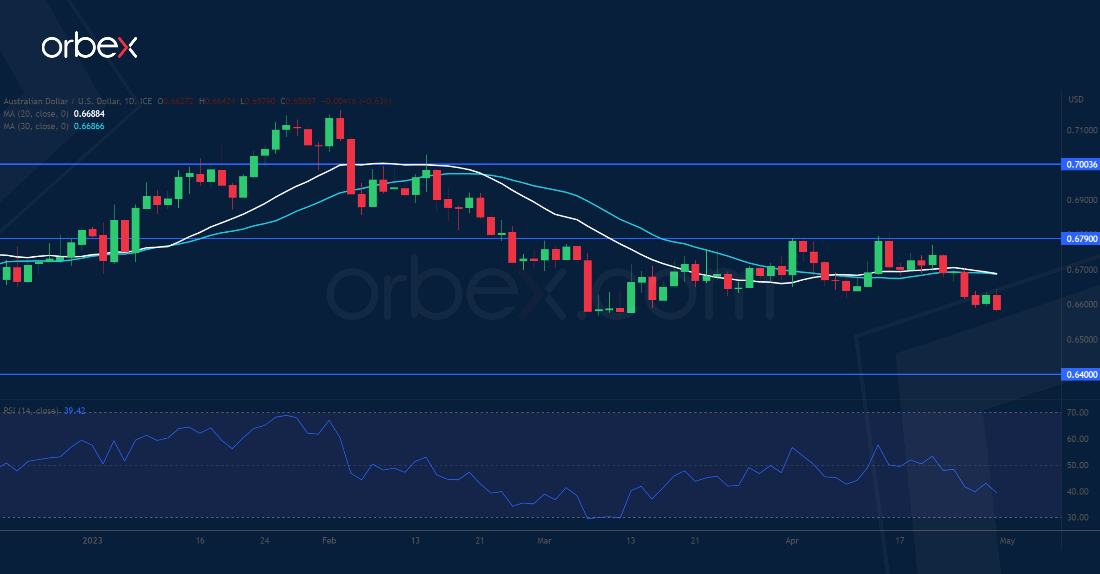 يواجه الدولار الأسترالي صعوبة في إحراز تقدم مقابل نظيره الأمريكي في ظل البيانات الاقتصادية العالمية الضعيفة. وقد شكلت أسعار المستهلكين الأساسية المتراجعة في الربع الأول مفاجأة للسوق وقد تؤكد أن التضخم ربما يتجاوز ذروته. ومن شأن هذا أن يخفف الضغط عن ضرورة رفع سعر الفائدة مرة أخرى هذا الشهر، مع توقعات المتداولين ألا يطرأ تغيير على سعر الفائدة من قبل بنك الاحتياطي الأسترالي. وقد يزيد مثل هذا الموقف الحذر القلق في أسواق السلع. ونظراً لكون أستراليا من أبرز مصدري النحاس، فإن عملتها قد تشهد انخفاضاً بموازاة المعدن حيث يشك المتداولون في النمو الاقتصادي العالمي. ويتجه الدولار الاسترالي نحو المستوى ٠.٦٤٠٠، بينما تقع المقاومة الأولى عند ٠.٦٧٩٠.