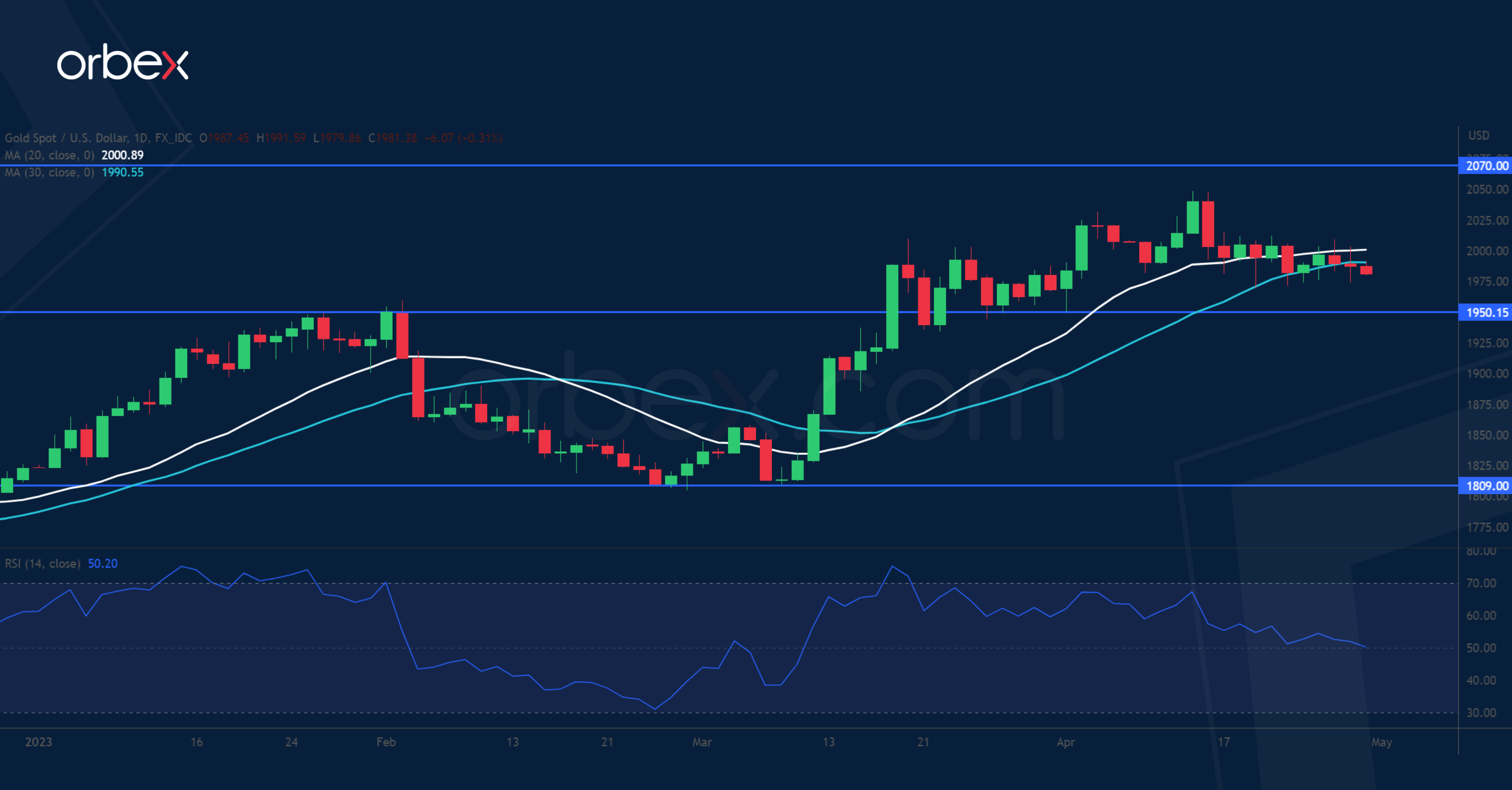 يبقى الذهب مرتفع بشكل جيد مقابل الدولار الأمريكي مع خوف المستثمرون من أزمة مالية جديدة. وقد أدى انخفاض الودائع في بنك “فيرست ريبابليك” على الرغم من ضخ ٣٠ مليار دولار من أكبر البنوك الأمريكية الشهر الماضي إلى تجدد الضغط على القطاع المصرفي. وإذا فشل أقرانها أو حكومة الولايات المتحدة في تنظيم عملية الإنقاذ، فإن هذا من شأنه أن يبعث برسالة إلى السوق تجعل الجميع يتساءلون عمن سيكون التالي. وعلى الرغم من أن سعر الذهب قد شهد بعض الحركات المتذبذبة خلال اليوم مع ارتداد الدولار الأمريكي، إلا أن حالة عدم اليقين العالمي والمخاوف من أزمة السيولة محتملة تدعم معدن الملاذ الآمن. ويتذبذب السعر أعلى ١٩٥٠، ويعد المستوى ٢٠٧٠ هو الهدف المباشر.