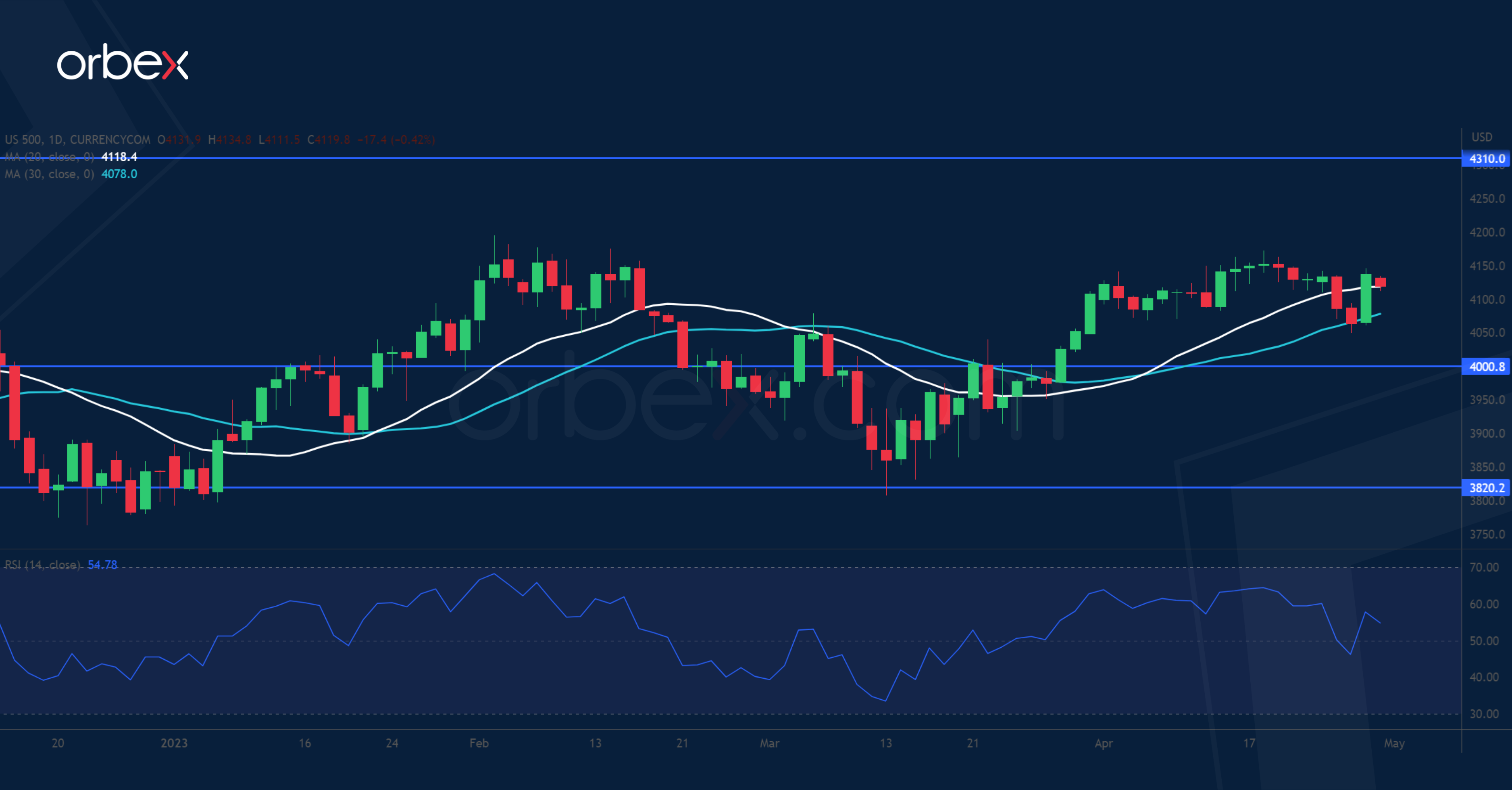 يتم تعزيز مؤشر “إس آند بي ٥٠٠” بفضل النتائج الفصلية الصلبة للشركات في الربع الأول التي تهدئ من المخاوف بشأن الركود. وفي ظل استمرار المخاوف بشأن تباطؤ النمو، كان فإن التقارير المذهلة من عمالقة التكنولوجيا “أمازون” و “ميتا” كان لها تأثير مهدئ. ففي النهاية، إذا كان الركود هناك ركود يتجلى، فإن انخفاض إنفاق المستهلكين والشركات كان ليؤثر على الأرباح. ومع ذلك، فإن سلسلة من المفاجآت الإيجابية تظهر مرونة الاقتصاد الأمريكي على المستويين الكلي والقطاعي. ومع زيادة القائدة الفيدرالية للمرة الأخيرة، يأمل السوق أن ينجح الاقتصاد في العبور دون عراقيل كبيرة. ويمثل المستوى ٤٣١٠ عقبة رئيسية أمام الارتفاع، ويعتبر المستوى ٤٠٠٠ القاع الرئيسي.