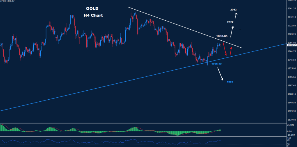 تمكن الذهب من الحفاظ على التداولات تحت المقاومة 1985 حيث تمكن مرة أخرى من التوجه نحو انخفاض آخر نحو الهدف ودعم منطقة 40-1935.