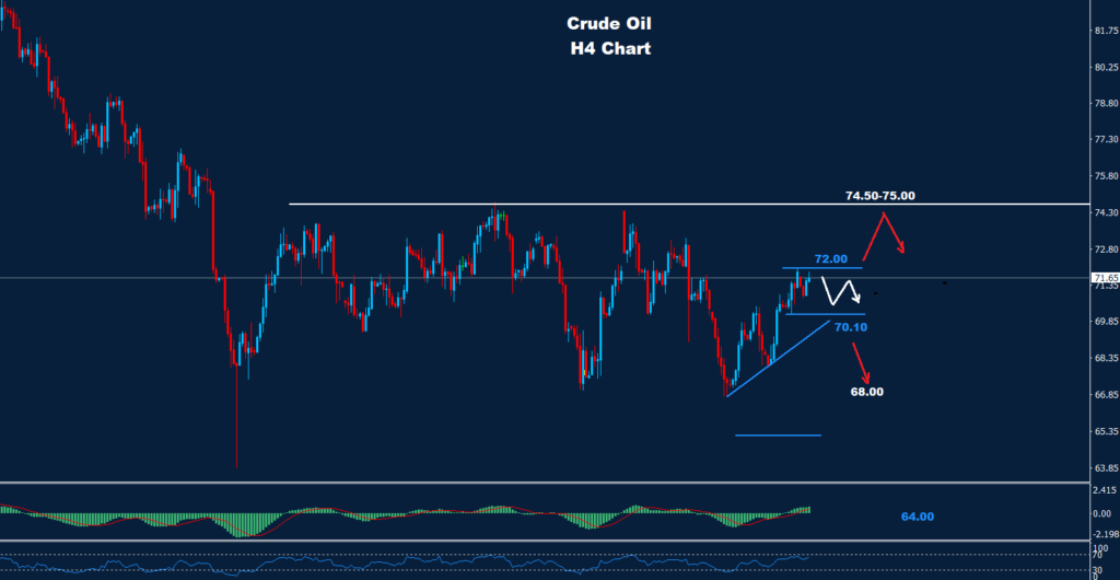 يواجه النفط الخام فرصة لمنطقة تداول صغيرة خلال اليوم بين الدعم 70.10 والمقاومة 72.00.