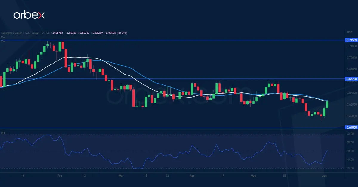 تراجع الدولار الأسترالي مقابل نظيره الأمريكي بفعل بيانات صينية ضعيفة تقلّل من الرغبة في المخاطرة. ويؤثر ركود أسواق السلع الأساسية بسبب المخاوف المتزايدة بشأن الطلب الصيني على المعنويات العامة. وقد شكل انخفاض أسعار خام الحديد والنحاس وهي الصادرات الرئيسية لأستراليا ضغطاً سلبياً على عملتها. ومن المرجح أن يتحول تركيز مؤيدو الاتجاه الصاعد إلى اجتماع بنك الاحتياطي الأسترالي في أعقاب ارتفاع مؤشر أسعار المستهلكين بنسبة ٦.٨٪ في أبريل بفعل أسعار الطاقة والإسكان التي تراوحت على مستوى مرتفع. وقد يكون البنك المركزي ميالاً لرفع أسعار الفائدة مرة أخرى في أقرب وقت ممكن، مما قد يوفر بعض الدعم للحد من انخفاض سعر الصرف. وفيما ويتجه الزوج هابطًا نحو ٠.٦٤٠٠، يقع مستوى المقاومة الأول أمام الارتفاع عند ٠.٦٨٢٠.