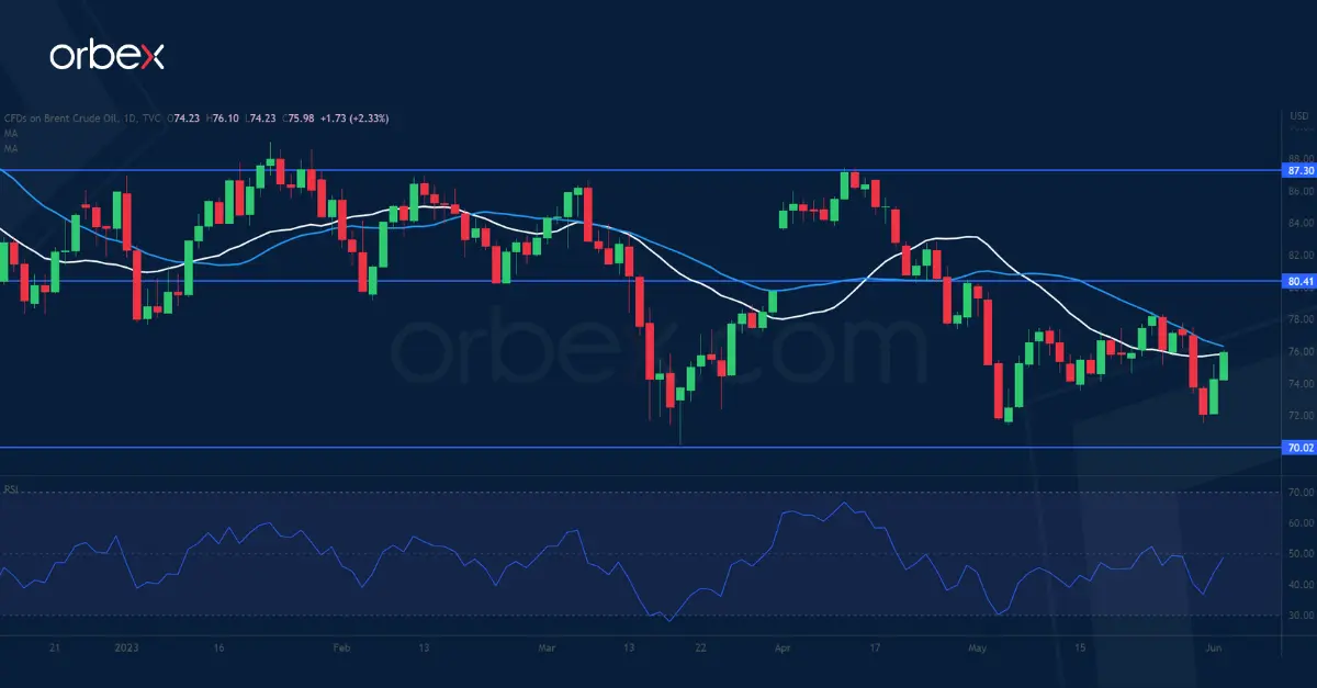 يكافح خام برنت من أجل الاستقرار مع عدم التيقن بشأن آفاق الطلب من قبل أكبر المستهلكين. إذ يضع ضعف نشاط التصنيع في الصين، أكبر مستورد للنفط في العالم علامة استفهام على استدامة الطلب. وفي الولايات المتحدة، أشار مسؤولو الاحتياطي الفيدرالي إلى أنه يمكن أن يتم تثبيت معدلات الفائدة في يونيو. وقد تساعد إشارة تعليق رفع الفائدة السعر على استعادة موطئ قدم في سوق وصل لذروة البيع. وسيكشف اجتماع أوبك+ عما إذا كان سيتم إجراء المزيد من الخفض على الإنتاج، ولكن في حين أن جانب العرض قد يؤدي إلى تقلبات، فإن سيناريو الطلب يبقى العامل الرئيسي الذي يؤثر في حركة السعر. وفيما يعد ٧٠.٠٠ مستوى دعم هام، تقع أقرب مقامة عند ٨٠.٤٠.