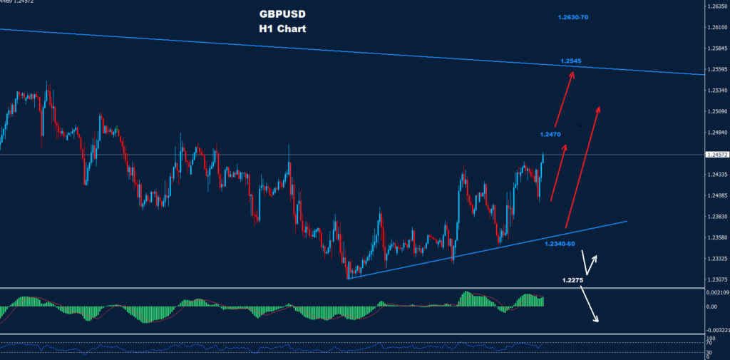 يقع الدعم الأول خلال اليوم عند 1.2400 بينما تتواجد المقاومة الأولى حول 1.2470.