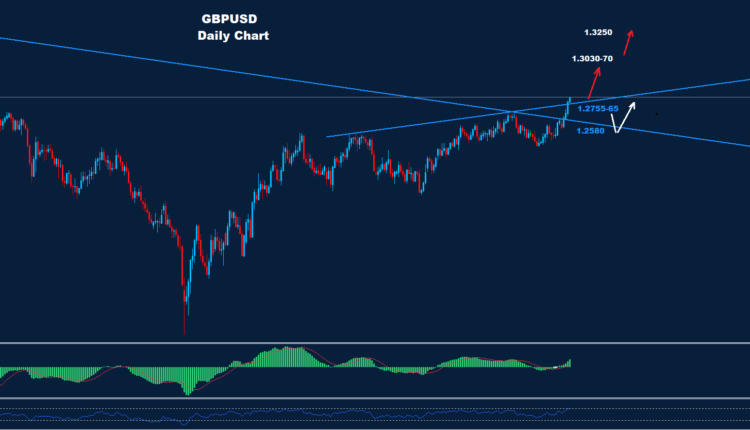تحت 1.2755، هناك فرصة لمزيد من الهبوط لإعادة اختبار منطقة الدعم 1.2580 التي قد تضرب السوق قبل أن يعود الارتفاع مرة أخرى على السوق.