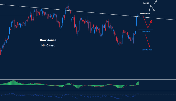 كما نرى على الرسم البياني، تواجه السوق منطقة مقاومة حول 950-33800 مما قد يدفع لبعض التصحيح الهبوطي نحو الدعم 300-33260.