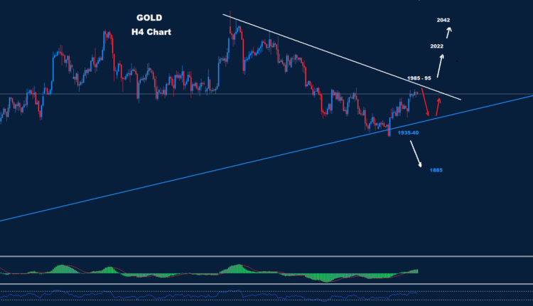 تمكن الذهب من الوصول إلى منطقة المقاومة الثانية حوال مستويات 1985 بينما كما نرى على الرسم البياني فإن منطقة مقاومة الترند الهابط تقع الآن حول 95-1985.