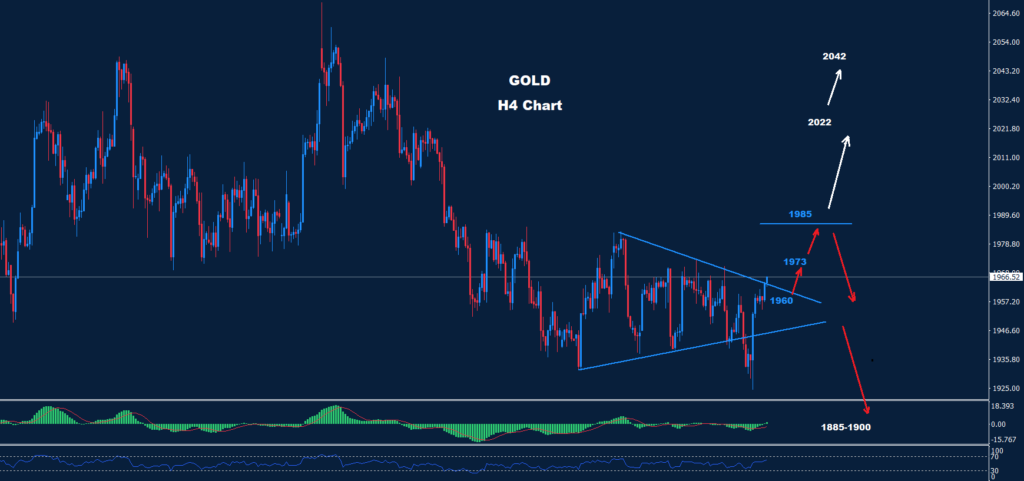 تمكن الذهب من التقدم فوق مقاومة 1960 ببضعة دولارات قبل العودة إلى التراجع و الهبوط بدون اختبار مستويات المقاومة الثانية 1973.