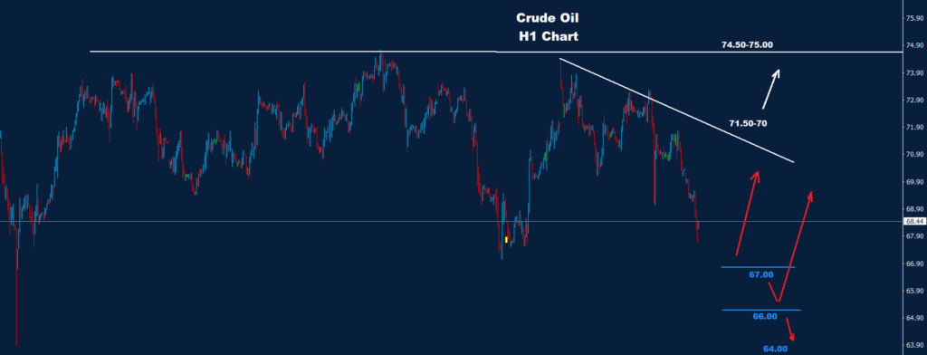 يواجه النفط الدعم الأول حول 67.00، بينما يقع الدعم الثاني عند 66.00 حيث طالما أن تداول السوق فوق أحد تلك المستويات فان فرص لتصحيحي ارتدادي صاعد قد تضرب السوق في أي وقت حيث توجد المقاومة عند منطقة 70-71.50.