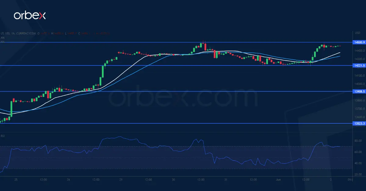 ارتد مؤشر “ناسداك ١٠٠” من جديد مع تباطؤ تضخم الأجور والذي يعزز الآمال بتعليق رفع أسعار الفائدة. وقد عزز المؤشر من مكاسبه أعلى ١٤٢٢٠ بعد صعود قوي لامس أعلى مستوى له في ١٤ شهراً. وعلى الرغم من حدوث انخفاض طفيف، إلا أنه لم يؤثر كثيراً على زخم الصعود. بل رأى فيه متابعو الاتجاه فرصة للشراء. وسيمكّن الإغلاق أعلى ذروة الارتفاع الأخير عند ١٤٥٠٠ المؤشر من العودة إلى المستوى ١٤٨٠٠ مع احتمالية استمرار الارتفاع نحو قمة مارس ٢٠٢٢ عند ١٥٢٥٠. وفي حال تراجع المؤشر دون ذلك، سيمثل المستوى ١٣٩٠٠ الواقع على طول المتوسط المتحرك البسيط لمدة ٢٠ يوماً دعماً مهماً.