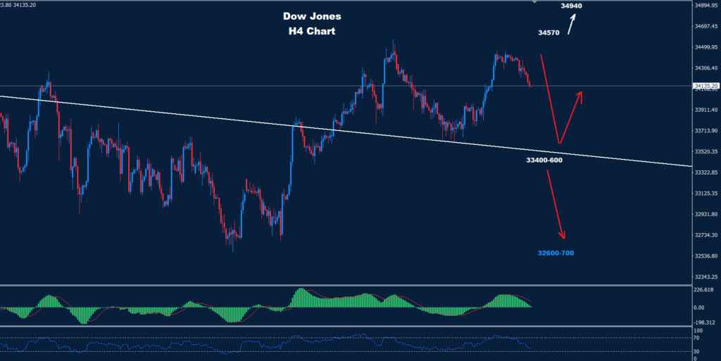 تمكن مؤشر الداو جونز من الحفاظ على التداولات تحت 34570 حيث تمكن من ضرب تصحيح هبوطي نحو الهدف 600-33400.