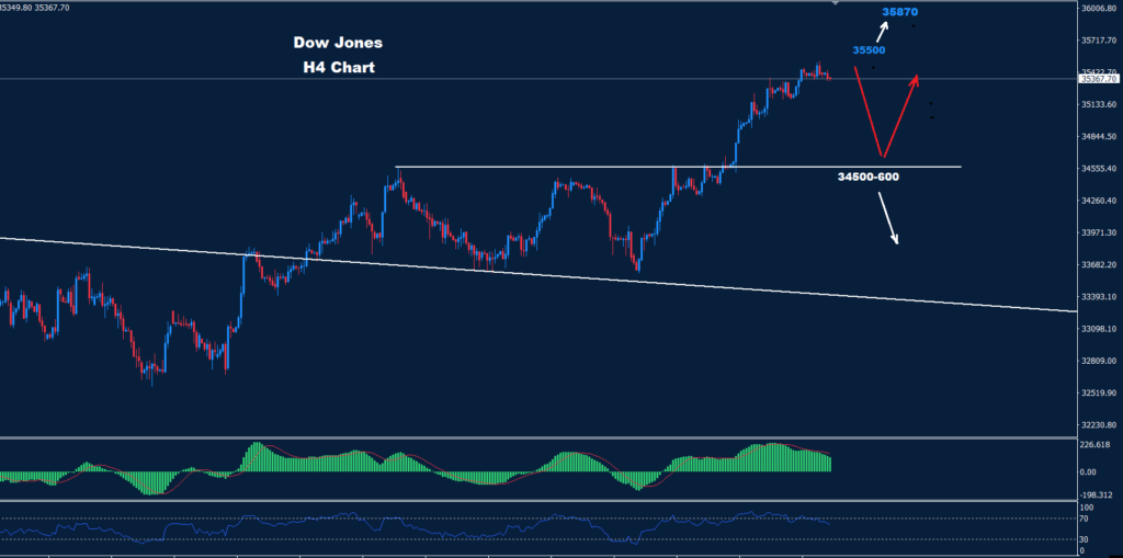 فوق 35500 فإن المزيد من التقدم قد يضرب السوق بمقاومة أخرى حول 35870 والتي بدورها قد تنشط تصحيح الهبوط هذا في السوق.